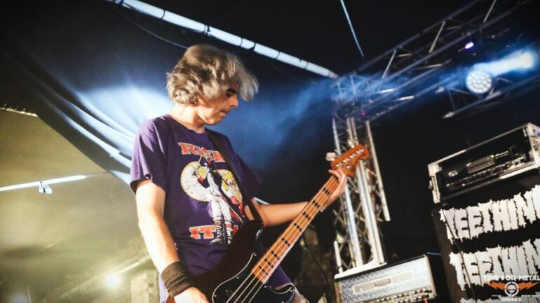 Was jetzt in der Halle folgt, ist definitiv ein Highlight. Ich hatte das Vergnügen, Teething bereits im letzten Jahr beim Deathfeast in Andernach zu erleben. Diese Band würde ich als ein Quartett aus Wahnsinnigen beschreiben, die Grindcore mit der rohen Energie und Geschwindigkeit von Hardcore verbinden – und dies alles gepaart mit einer gehörigen Portion Humor. Seit 2011 sind sie unterwegs, und auf der Bühne geht es richtig ab: Es wird gesprungen, gehopst und ausgelassen gefeiert. Im Mittelpunkt steht Luis, ihr Mann am Mikro, mit ultralangen Zöpfen, der die Menge mit seiner Energie ansteckt. Zu Beginn trägt er noch eine gelbe Maske über dem Kopf, die er allerdings schnell verschwinden lässt. Damit die Band keinen Durchfall bekommt, ist Diaroe-Frontmann Christian Markwald (Ex-JAKA) auch auf einmal auf der Bühne und gibt seinen Senf bzw. Vocals dazu. Die Halle kocht förmlich vor Begeisterung. Luis wagt sogar das Stagediving, tanzt über die Köpfe der Fans hinweg – eine heiße Nummer, die hier alle mitreißt.