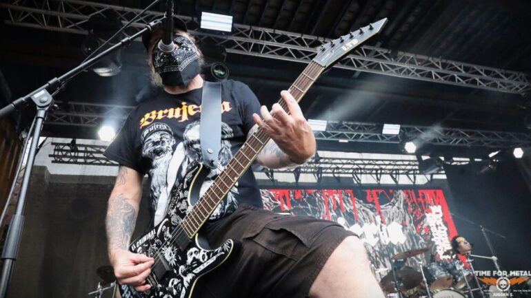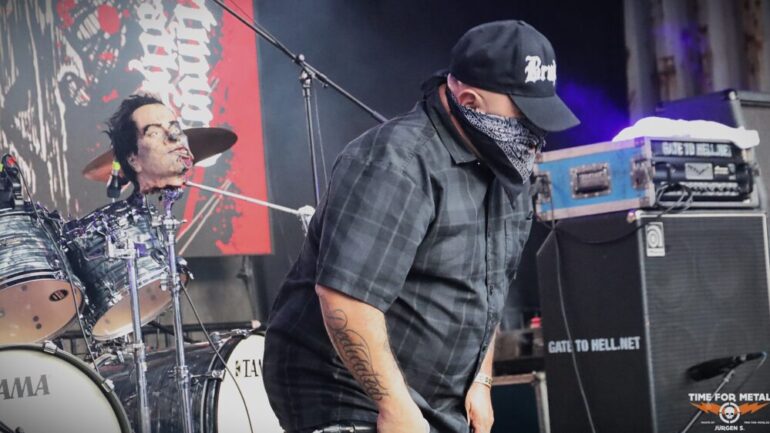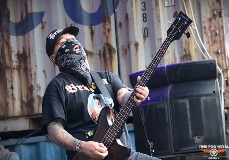 Zurück im Junkyard: Es folgt ein spektakuläres Programm nach dem anderen. Fulci und Macabre waren draußen schon unfassbar stark – und dann begrüßt uns ein abgeschlagener Gummischädel auf der Bühne: Brujeria aus Los Angeles. Die Gang um Frontmann El Sangrón aka Henry Sanchez sorgt für gewaltigen Aufruhr. Ein Gründungsmitglied von Brujeria ist auch ein gewisser Dino Cazares (Fear Factory), der die Band allerdings schon vor ewigen Zeiten verlassen hat. Die Band mit ihren typischen Bandanas liefert hier eine Revolution. Moshpits und Crowdsurfen sind angesagt. Höhepunkt ist sicherlich, als Cheffe El Sangrón das Publikum nach einem Joint fragt und mindestens 20 bis 30 Joints auf ihn zufliegen – woraufhin Brujeria ihren Hit Don Quijote Marijuana anstimmen.