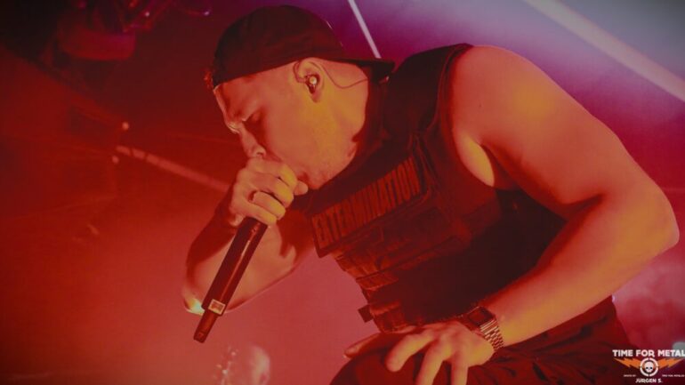 Das endgültige Finale findet dann in der Halle statt, denn dort spielt die letzte Band des heutigen Tages. Deren Frontmann Vladislav konnte ich heute Nachmittag schon begrüßen. Es handelt sich um Extermination Dismemberment. Die Band aus Weißrussland (Belarus) spielt Slamming Brutal Death Metal der absoluten Klasse. Ich habe sie persönlich schon mehrfach beim Deathfeast in Andernach live erlebt. Vladislav, sowie seine Bandkollegen in schützenden Westen (das ist hier in der Halle doch bestimmt eine echte Qual), konnten jedes Mal begeistern. Das Album Butcher Basement habe ich mir 2017 in einer limitierten Green Splatter Vinyl-Version gegönnt – ein absolutes Must-Have damals und heute noch. Auch heute wieder einmal eine Offenbarung: Extermination Dismemberment liefern ab. Auch eine junge Dame, die ich draußen bereits mindestens 20-mal Crowdsurfen gesehen habe, liefert ab. Jetzt in der Halle verdreht sie sich dabei wohl den Fuß und sie muss zu den Sanitätern humpeln. Hoffen wir mal, dass es nicht zu schlimm ist, und von hier aus gute Besserung!