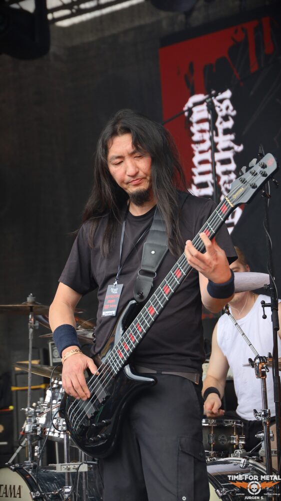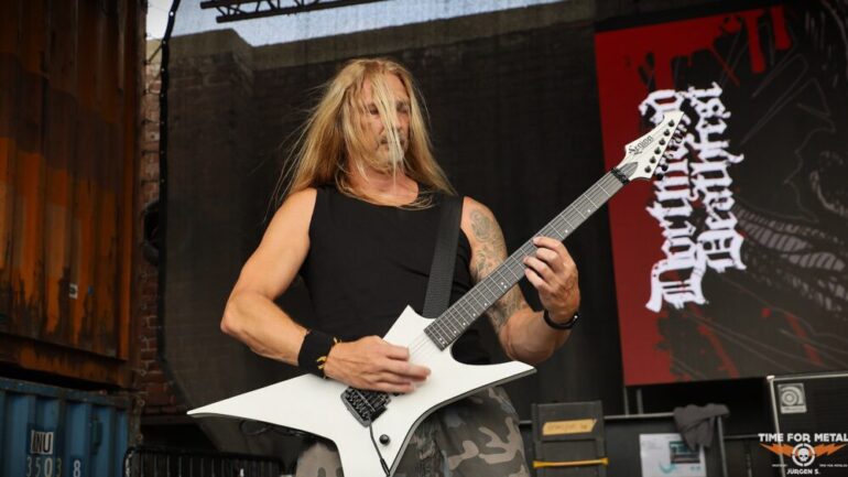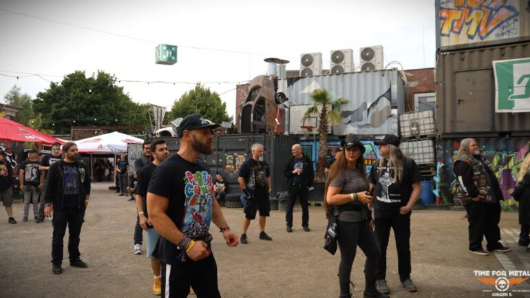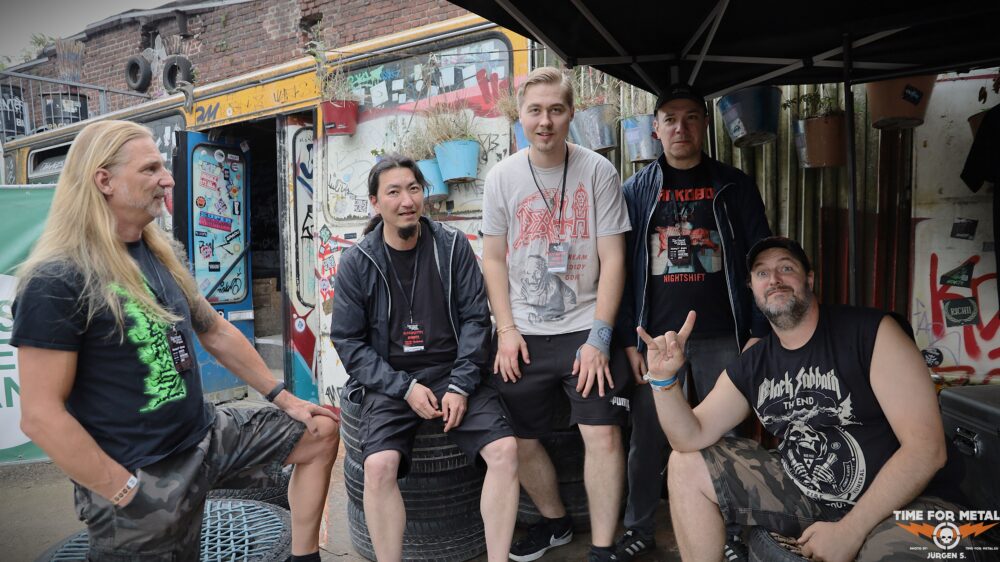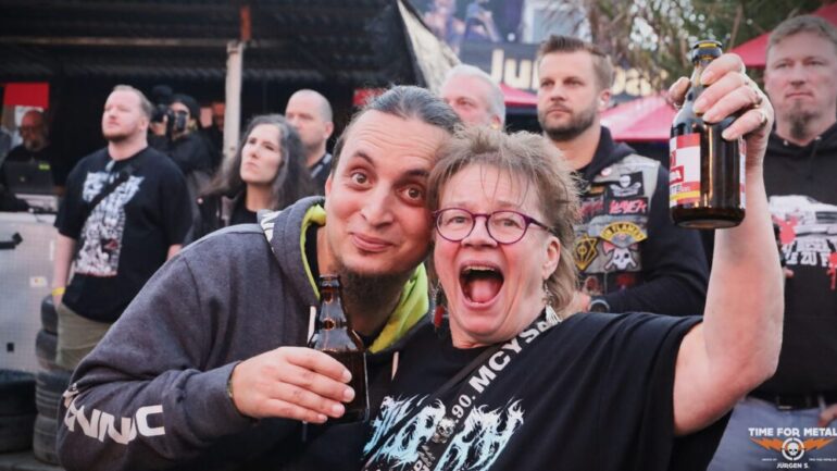 Kurz nach ihrem Auftritt ist die komplette Band am Merchstand zu finden. Die Fans haben bereits auf sie gewartet, und es herrscht reges Treiben – der Absatz ist erfreulich hoch. Die Bandmitglieder sind bestens gelaunt, entspannt und nehmen sich Zeit für persönliche Gespräche. Für Selfies stehen sie ebenfalls gerne zur Verfügung, was die Stimmung noch weiter auflockert. René hat sich für den Wacken-Gig in diesem Jahr (sie haben dort gestern gespielt) etwas Besonderes einfallen lassen: Er hat eigens Gitarrenplektren anfertigen lassen, die er großzügig unter den Fans verteilt. Damit zeigt er nicht nur seine Verbundenheit zum Publikum, sondern sorgt auch für bleibende Erinnerungen an diesem besonderen Abend.