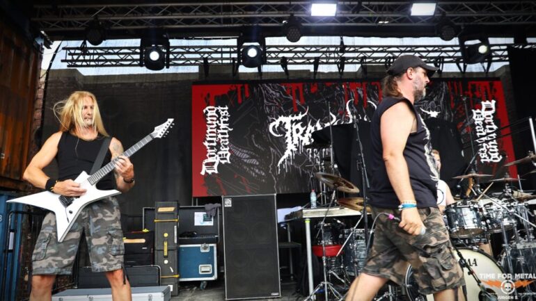 Pünktlich starten wir mit Transgression. Die Old-School-Death-Metal-Band aus Leverkusen hat seit Ende der Neunzigerjahre mehrere Releases in wechselnder Besetzung veröffentlicht. Mitten in der Coronakrise 2021 sind sie plötzlich wieder zurück und nehmen kein Blatt vor den Mund. Transgression bringen eine Menge Live-Erfahrung mit, waren sie doch bereits gemeinsam mit Bands wie Vader, Krisiun, Pungent Stench, Misery Index oder Dew-Scented auf der Bühne. Die Leverkusener Band um Urgestein René Hollweg ist heute Abend der perfekte Einstieg und sorgt für die richtige Energie. Ihr Old School Death Metal, gewürzt mit einigen Thrash-Attitüden, kommt bei den Fans hier besonders gut an. René Hollweg ist in der Szene kein Unbekannter; er war unter anderem auch Mitglied bei der Band Asmodina, die einst Angela Gossow hervorbrachte – die später den Melodic Death Metal bei den Schweden Arch Enemy maßgeblich prägte. Bei Transgression steht allerdings kein Melodic Death im Fokus, und das ist auch gut so. Die Jungs bleiben richtig erdig und authentisch.