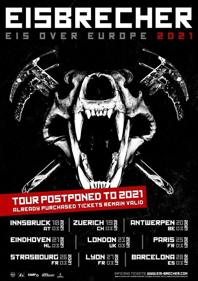 Im Mai 2020 sollten die Münchner Erfolgsrocker von Eisbrecher auf der Eis Over Europe Tour in internationale See stechen. Auf insgesamt neun Shows sollte die Band um Frontmann Alex Wesselsky insgesamt sieben Länder bespielen: Österreich, Niederlande, Frankreich, Schweiz, England, Belgien und Spanien. Dann kam die Corona-Pandemie und die Tour musste verschoben werden. Nun müssen die Fans sich in Geduld üben, denn die Shows werden erst im nächsten Jahr nachgeholt. Jedoch hat das Ganze auch etwas Gutes, denn bis dahin werden Eisbrecher ihr neues achtes Album fertiggestellt haben, welches in der zweiten Jahreshälfte 2020 auf den Markt kommt. Bereits gekaufte Tickets behalten ihre Gültigkeit.