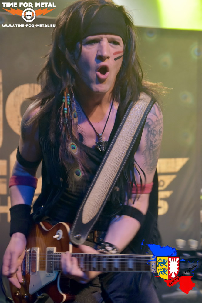John zieht sich dann noch um und erscheint mit weißen Chaps, während seine Musiker Gas geben. Drummer Lee Stingray lässt es im Hintergrund ordentlich krachen und das lässt kaum jemanden ruhig bleiben. Mit Lolita, Blinded und Wildlife geht es weiter und sie verstehen es, zumindest für die Meisten, ordentliche Stimmung zu machen. Selbst Rollifahrer Rainer lässt sich anstecken und fängt mit seinem Turbo Rollstuhl an zu hüpfen – das wird dann honoriert und er bekommt von Lee Stingray als Anerkennung einen Stick geschenkt. John schafft es dann auch die hinteren Reihen zu motivieren und da kommt mächtig Stimmung auf. So soll ein Support sein. Früher nannte man diese Bands Anheizer und das klappt hier super. Die Zeit geht schnell rum und mit Rocket Of Love endet der Auftritt nach vierzig Minuten. Es gibt noch ein Abklatschen und auch das gute Firewater Getränk macht die Runde.
