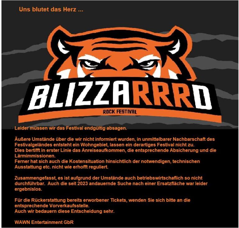 Nachdem die Veranstalter am 22.05.2023 eine Verschiebung des Festivals auf den 11. bis 13. Juli 2024 verkündet haben, wurde das Event nun am 02.07.2024 komplett abgesagt.