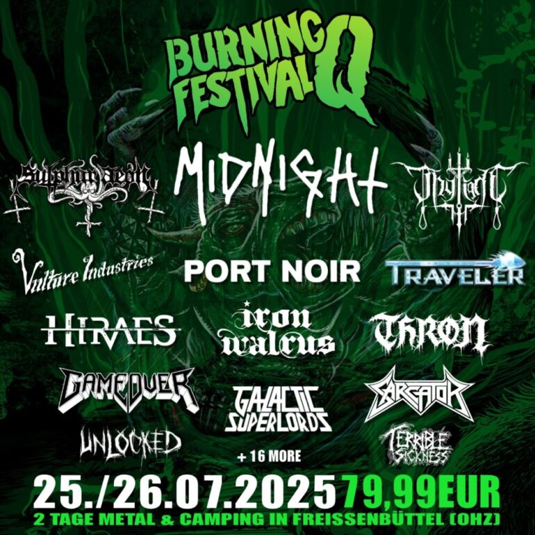 Als Headliner fungieren Benediction, Night Demon und Midnight. In der zweiten Reihe warten Szenegrößen wie Ghost Bath, Sulphur Aeon, Thy Light und The Crown. Alleine diese sieben Acts sind wahre Leckerbissen für die ganze Underground-Gemeinschaft. Mit dabei sind auch die Senkrechtstarter Hiraes um Sängerin Britta Görtz oder auch Yoth Iria. Wer sich über das pralle Line-Up wundert, das Burning Q Festival findet auf einer Open Air Stage und einer Zeltbühne ohne Überschneidungen statt. Durch die zwei Bühnen können die Veranstalter an zwei Tagen deutlich mehr Bands spielen lassen, als würde man, wie auf anderen Open Airs ähnlicher Größe, mit Umbauzeiten für Leerlauf sorgen. Mit einem Ticketpreis von 79,90 € ist es das Burning Q Festival zudem in einem fairen Preissektor zu Hause. Das Frühanreiseticket für Donnerstag ist für schmale 10,00 € zu haben, aber nur in Verbindung mit einem Festivalticket. Musikalisch gibt es dafür auch direkt am Donnerstag was geboten, so werden im Zelt die Bands Iron Priest, Rockzanne und Kabila allen Frühanreisenden einheizen.