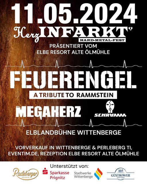 Dieses Jahr findet das HerzINFARKT – Hard Metal Fest 2024 am 11.05.2023 in der atemberaubenden Kulisse des Elbe-Resorts Alte Ölmühle statt und verspricht, eine Nacht voller Headbanging und energiegeladener Musik zu werden. Die Bühne wird von drei Acts dominiert, die jeweils den Sound und die Energie einiger der bekanntesten und einflussreichsten Metalbands auf dem Planeten wiedergeben werden. Feuerengel, eine Rammstein-Tributband, werden, wie bereits im letzten Jahr, mit ihren bombastischen und explosiven Performances das Publikum in ihren Bann ziehen. Dazu gesellen sich Megaherz, die ebenfalls der neuen deutschen Härte zuzuordnen sind. Als letzter Act und Opener sind noch Schramm dabei. Die Jungs aus Greifswald und von Usedom sind auch in der neuen deutschen Härte zu Hause, aber hier kommen noch Dark Rock, EBM und Metal dazu. Das hört sich spannend an.