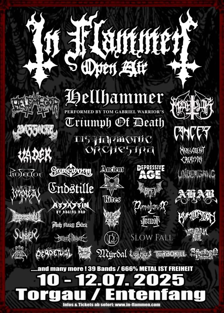 Die Festivalsaison ist in vollem Gange und auch das In Flammen Open Air öffnet vom 10. bis zum 12. Juli zum 19. Mal seine Tore für “Deutschlands Hellish Gartenparty”, das am Entenfang Torgau stattfindet. Dieses jährlich stattfindende Festival ist in den Kreisen der Death, Thrash und Black Metal Fans längst kein Unbekanntes mehr und so haben Thomas Richter und seine Crew auch dieses Jahr wieder ein Line-Up auf die Beine gestellt, das sich sehen lassen kann.