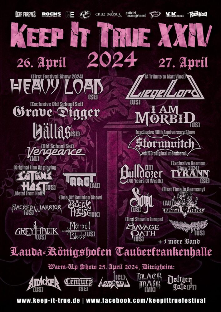 Dieses Jahr findet das Keep It True Event zum 24. Mal in der Tauber-Franken-Halle in Lauda-Königshofen statt. Nach den drei Tagen des letzten Jahres kehrt das Festival zu den gewohnten zwei Veranstaltungstagen zurück. Es gibt allerdings am Donnerstag noch eine Warm-Up-Party in Dittigheim mit Attacker, Century, Black Mask, Dolmen Gate und einer weiteren Band. Für die Warm-Up-Party gibt es leider keine Tickets mehr. Ansonsten gibt es für das KIT 2024 noch Karten. Das Festival hat sich schnell zu einem der wichtigsten Treffen der weltweiten Heavy-Metal-Community entwickelt und zieht seit jeher Fans aus der ganzen Welt an, die die Gelegenheit nutzen, ihre Lieblingsbands zu sehen und sich mit Gleichgesinnten zu treffen. Deshalb heißt es schnell sein, denn das Kontingent ist endlich.