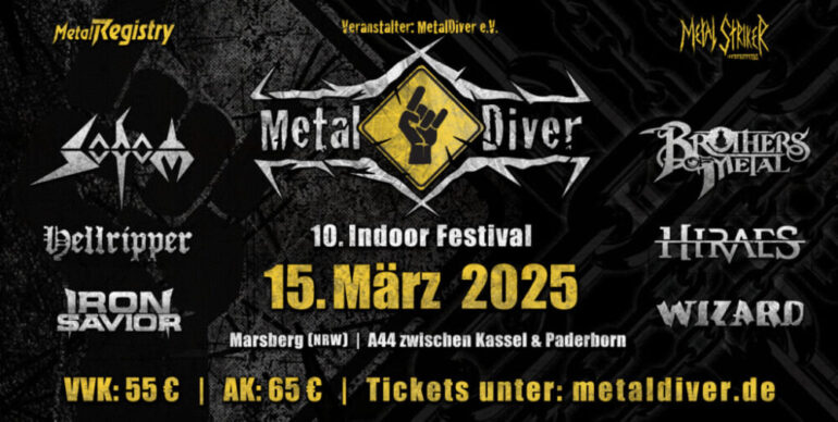Seit mittlerweile einer Dekade organisiert der Metal Diver e. V. aus Marsberg, gelegen zwischen Paderborn und Kassel, sein jährliches Metal Diver Festival. Die Indoor-Veranstaltung findet im Schützenhaus Marsberg statt und ist bereits restlos ausverkauft. Kein Wunder, denn zur Jubiläumsausgabe haben die Organisatoren eine wirklich illustre Bandauswahl auf die Beine gestellt. Diese wurde bereits während der 2024er-Ausgabe bekannt gegeben, das heißt, ein Jahr Vorfreude auf den 15. März 2025.