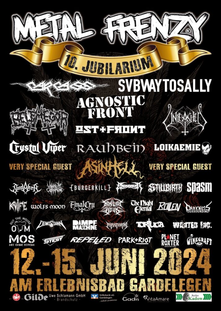 Das Metal Frenzy Festival ist ein jährliches Event, das normalerweise Ende Juni oder Anfang Juli in Gardelegen, Deutschland, stattfindet. Das Festival bietet neben einer Vielzahl von Metal-Genres wie Death-, Black-, Thrash- und Power Metal auch Punk, Rock und vielen anderen Stilen eine Plattform. So sind dieses Jahr neben Carcass, Agnostic Front und Subway To Sally noch diverse weitere Bands, die an drei Tage die Gäste zum Schwitzen bringen werden. Natürlich gibt es weitere Highlights und all das, was zu einem echten Festival dazugehört.