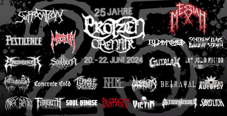 Das Protzen Open Air feiert dieses Jahr sein 25. Bestehen. Das überschaubare Festival, mit etwa 1000 Besuchern ist auf dem Gelände der Biker „Deadland“ beheimatet und wartet mal wieder mit einem fetten Line-Up auf. Vor allem Death Metal Herzen werden hier höherschlagen. Aber nicht nur Death Metal Freunde kommen auf ihre Kosten, auch andere Genres sind mit am Start. Des Weiteren gibt es zwischendurch auch etwas Zeit zum Aufatmen, um sich eine Hopfenkaltschale oder eine der famosen Pizzen zu gönnen (es sei die Speciale, einmal mit ALLES, empfohlen!).