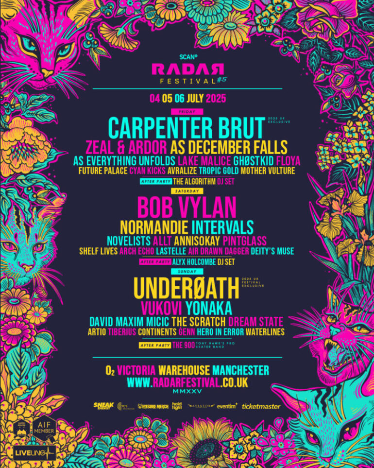Mit Carpenter Brut ist einer der größten Namen der düsteren Synthwave-Szene erstmals exklusiv in UK für Radar zu erleben. Underøath bringen ihren post-hardcoregetriebenen Metalcore exklusiv auf die Festivalbühne, während Bob Vylan mit seinem kompromisslosen Crossover aus Punk, Rap und gesellschaftskritischem Feuer für politische Wut sorgt – Radar bleibt seinem Ruf treu, Grenzen zu verwischen und Neues zu wagen.