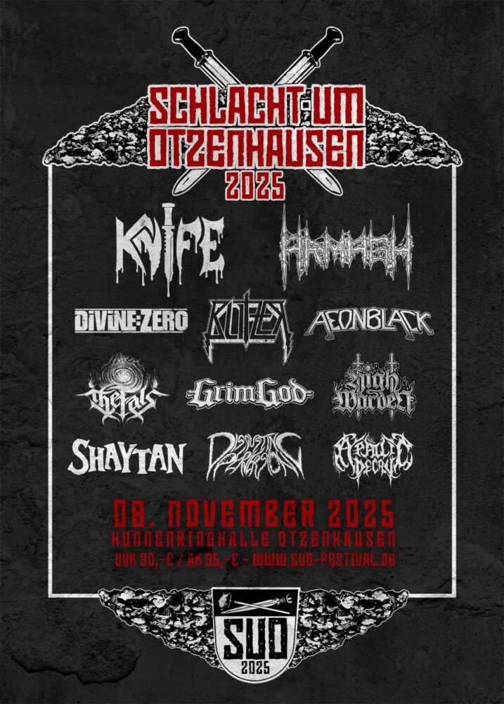 Obwohl es erst im November so weit ist, haben die Celtic Warriors Otzenhausen e. V. bereits vor der großen Festivalwelle ihr Line-Up fertig. Am 08.11.2025 steigt die diesjährige Schlacht Um Otzenhausen, erneut in der Hunnenringhalle im idyllischen Otzenhausen im Saarland. Als Headliner sind die Speed Metaller von Knife aus Marburg am Start, dazu gibt es noch Black, Death, Melodic Death und vieles mehr auf die Lauscher. Einlass ist ab 16:30 Uhr, los geht es um 17 Uhr.