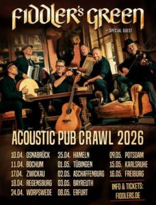 Acoustic Pub Crawl 2026 ist damit mehr als ein Jubiläum – es ist eine Einladung, 35 Jahre Fiddler’s Green gemeinsam zu feiern: handgemacht, lebendig und unberechenbar wie eh und je.