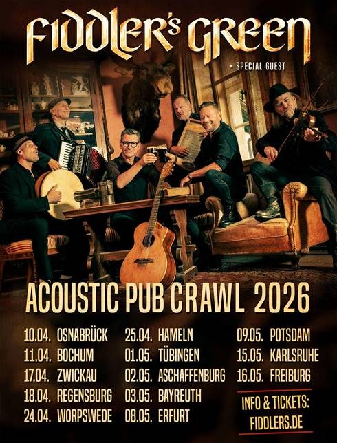 Die Akustiktour zum 35. Jubiläum von Fiddler’s Green! Seit 35 Jahren bringen Fiddler’s Green mit ihrem „Irish Speedfolk“ die Säle zum Kochen. Zum Jubiläum überraschen die Folkrocker ihre Fans mit einer ganz besonderen Tour: Acoustic Pub Crawl 2026