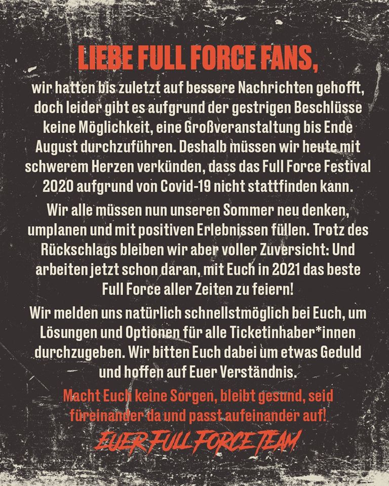Nach der gestrigen Schaltkonferenz zwischen den Ministerpräsidenten der Länder und der Bundeskanzlerin Angela Merkel und dem damit einhergehenden Verbot für Großveranstaltungen in Deutschland bis zum 31. August 2020, war klar, das bedeutet das sichere AUS für die allseits geliebten Sommerfestivals. Nachdem heute Morgen schon das Wacken, das Bang Your Head, das Rock Am Ring / Rock Im Park, das Rock Of Ages, das Southside, das M`era Luna, das Hurricane und einige andere abgesagt wurden, haben sich nun die Veranstalter des Full Force Festival in Gräfenhainichen zu Wort gemeldet. Das Festival war für den 26.06. – 28.06 2020 auf dem Ferropolis Gelände geplant. Leider fällt auch das Event in die Kategorie Großveranstaltungen und musste daher nun abgesagt werden. Jede Absage ist im Moment bitter für alle Headbanger, dennoch ist die Entscheidung gut und richtig, denn die Sicherheit und Gesundheit von Bands, Veranstaltern, Crews und Publikum muss oberste Priorität haben.