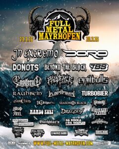 Neben hochkarätigen Szenegrößen wie In Extremo, Donots, Beyond The Black, Emil Bulls sowie Doro, der Metal Queen höchstpersönlich, ist mit der Bekanntgabe des finalen Line-Ups das Programm inklusive Tagesaufteilung für Full Metal Mayrhofen 2026 komplett und verspricht, die Berge zum Beben zu bringen! Ab sofort ist zudem eine limitierte Anzahl an Tagestickets erhältlich – schnell sein lohnt sich.