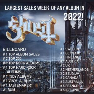 In den USA gelang Ghost mit Impera gar die physisch erfolgreichste Album-Releasewoche des Jahres. Kein:e andere:r Künstler:in setzte 2022 in der Startwoche mehr Tonträger ab als die Theatrical Rock Band. Insgesamt kommen Ghost laut Billboard auf fast 70.000 Einheiten, was zugleich auch Platz 1 in den Current Rock Album, Current Hard Music Album, Vinyl Album and Digital Album Charts sowie Platz 2 in den Billboard 200 bedeutete. Weitere fantastische Ergebnisse verzeichnet die Band unter anderem in Großbritannien (#2), den Niederlanden (#2), Norwegen (#2), Belgien (#2), Kanada (#3), Australien (#3), Frankreich (#5), Irland (#5) und der Schweiz (#5).