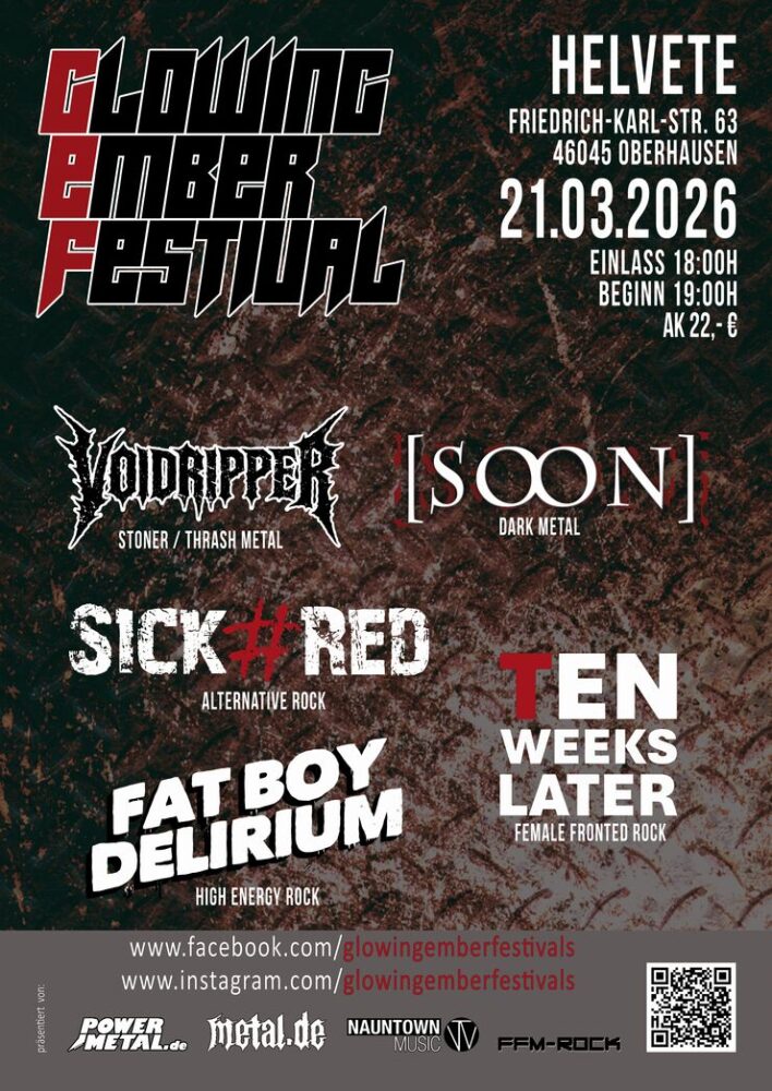 Das erste Konzert der diesjährigen Glowing Ember Festival Tour findet im Ruhrpott statt. Auf dem IX. Glowing Ember Festival Nordrhein-Westfalen am Samstag, dem 21. März 2026, im Helvete in Oberhausen wird Rock und Metal in den verschiedensten Schattierungen von insgesamt 5 Bands geboten.