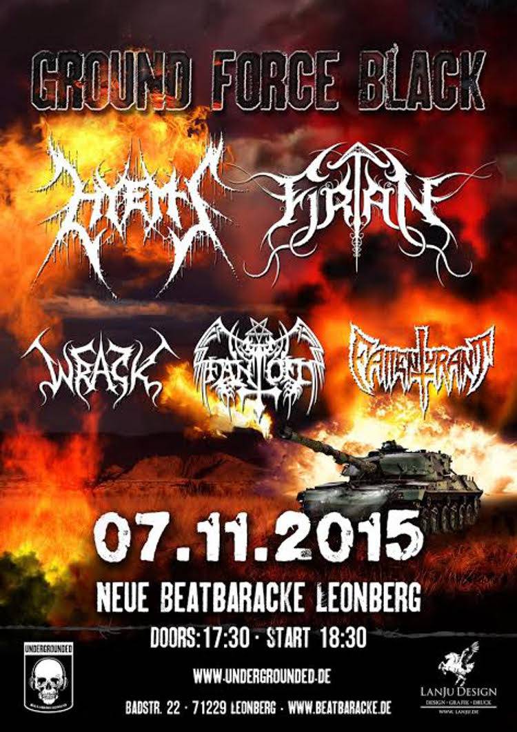 Um die Zeit zum Ground Force II zu verkürzen, haben wir für den November ein besonderes Event der schwarzmetallischen Art geplant – Das Ground Force Black! Angeführt vom Doppel-Headliner Hyems und Firtan(UG) werden Wrack (UG), Fallen Tyrant (UG) und Fantoft die neue Beatbaracke in Leonberg zum Beben bringen!