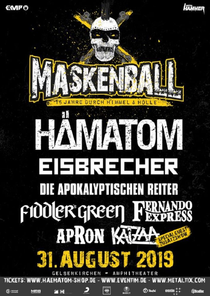 Wie bereits angekündigt, feiern Hämatom am 31. August 2019 gemeinsam mit ihren Fans, der Band Eisbrecher, Serum 114, Fiddler’s Green, apRon und Fernando Express ihr 15-jähriges Jubiläum im wunderschönen Amphitheater in Gelsenkirchen.