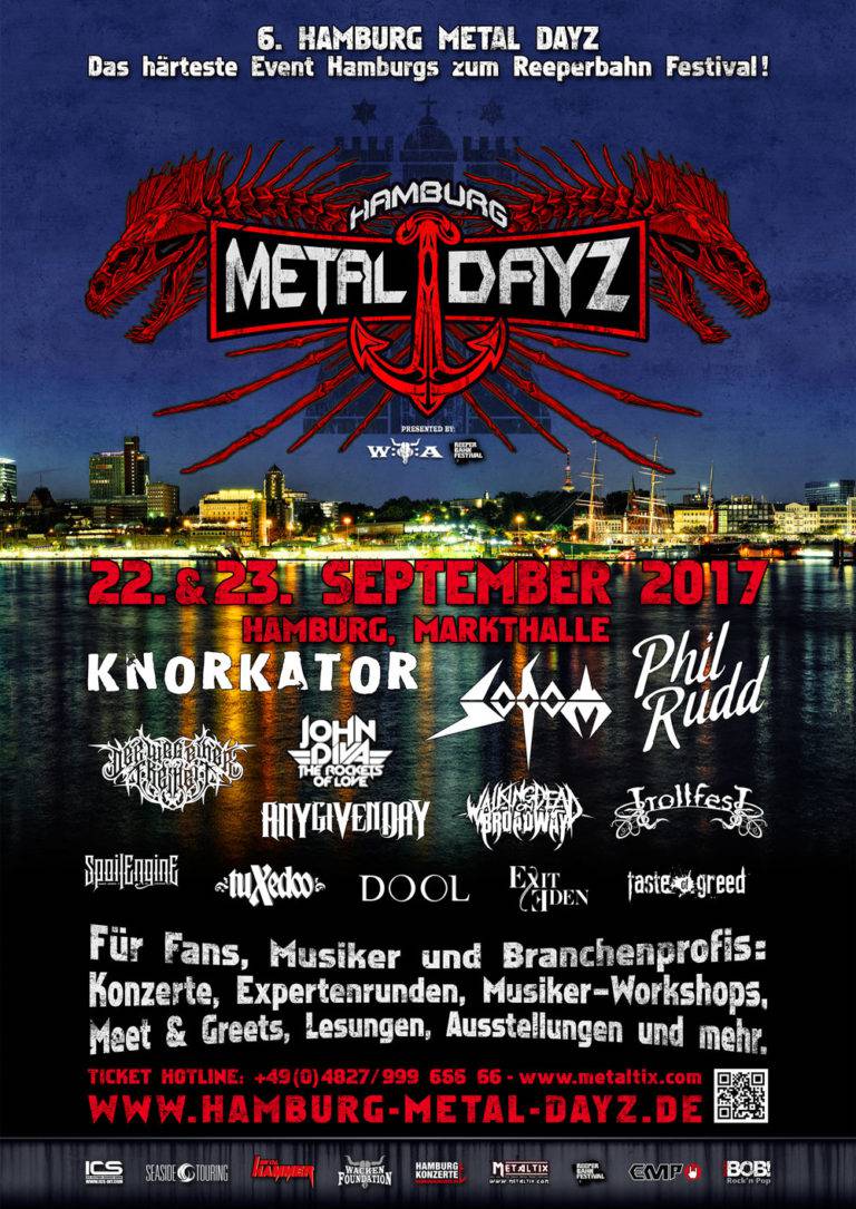 Am 22. und 23. September 2017 starten die Hamburg Metal Dayz in der Markthalle in ihre sechste Runde. Exit Eden und Walking Dead On Broadway komplettieren das Line-up mit insgesamt 13 Bands. Nun steht auch die Running Order fest – am Freitag headlinen Sodom und am Samstag Knorkator. Die Tagestickets sind ab jetzt im Verkauf.