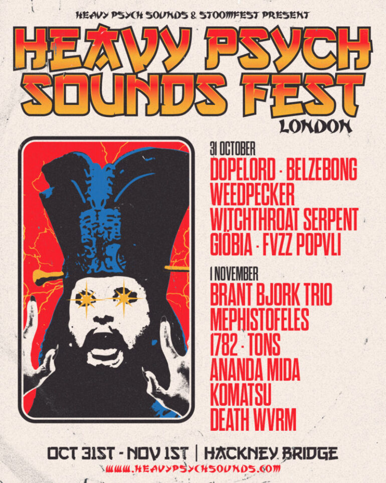 Das Heavy Psych Sounds Fest London hat die Tageseinteilungen für seine diesjährige Ausgabe bekanntgegeben, die am 31.10.2025 und 01.11.2025 im Hackney Bridge stattfinden wird. An zwei Abenden verwandelt sich die Location in ein Mekka für Stoner-, Doom- und Psychedelic-Fans, wenn internationale Größen und Underground-Kultbands ihre wuchtigen Riffs und hypnotischen Sounds entfesseln. Mit dabei sind unter anderem das Brant Bjork Trio, das mit lässigem Desert-Rock-Schwung auftritt, sowie die polnischen Doom-Meister Dopelord und Belzebong, die mit schweren, rauchgeschwängerten Klangwänden für dichte Atmosphäre sorgen. Aus Argentinien reist Mephistofeles an, deren sabbathesker Sound für finstere Grooves sorgt, während Weedpecker mit harmonischem Fuzz und 1782 mit apokalyptischen Klangbildern die Bühne erobern. Psychedelische Höhenflüge sind mit Giöbia garantiert, Tons bringen dröhnende Riffs voller Marihuana-Verehrung, und Komatsu aus den Niederlanden liefern präzise, druckvolle Sludge-Gewalt. Ananda Mida betören mit meditativen Doom-Strukturen, Fvzz Popvli steuern energiegeladene Fuzz-Attacken bei, und die Lokalmatadore Death Wvrm runden das Line-up mit düsterer Schwere ab.