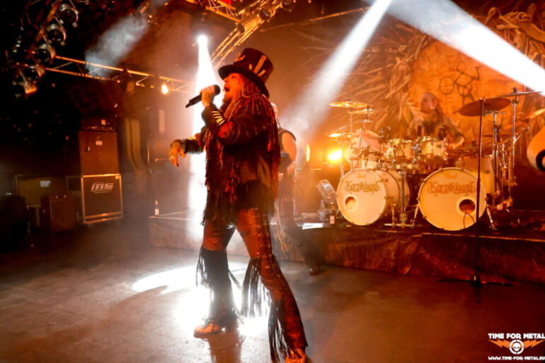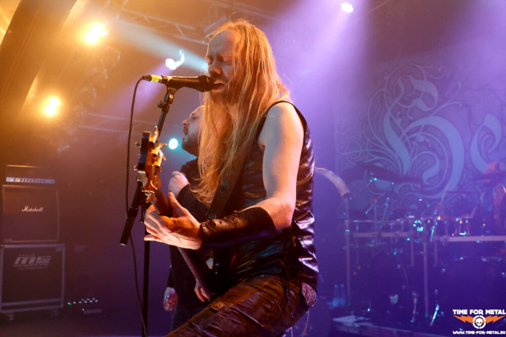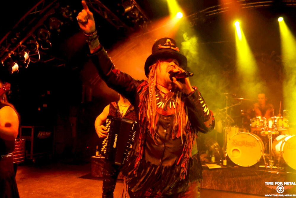 Der erste Publikumsmagnet scheinen Heidevolk aus den Niederlanden zu sein, die bereits vom Namen perfekt zum Heidenfest passen. Musikalisch dreht es sich um Pagan- und Folk Metal, den die Herren seit fast 25 Jahren zelebrieren. Von den Anfangstagen ist niemand mehr in der Band. Rowan Roodbaert ist seit 2006 am Bass dabei und seit dem zweiten Release Walhalla Wacht auf jedem Album vertreten. Die Hälfte des Sextetts ist erstmals auf dem 2023er-Release Wederkeer zu hören. Darunter ist auch die Hälfte des Gesangs. Daniël Wansink übernahm 2022 von Lars NachtBraecker beziehungsweise dem ehemaligen Drummer und Bandmitbegründer Joost Vellenknotscher. Das Duo Jacco de Wijs und Daniël Wansink ist nicht schlecht, liefert aber nicht die Energie, die de Wijs und NachtBraecker auf die Bühne brachten. Das zeigt sich vor allem bei den älteren Nummern wie Walhalla Wacht oder Ostara. Sehr gelungen ist der A Capella-Teil bei Oeros vom aktuellen Album Wederkeer. Das 2018er-Release Vuur De Verzet steuert mit drei Nummern den Löwenanteil zu dem 45-minütigen Auftritt bei, sodass vor allem de Wijs stark aus den Boxen kommt. Auch wenn es an der einen oder anderen Stelle noch nicht ganz rund für Heidevolk läuft, sind die Niederländer der erste gefeierte Akt des Abends, bei dem sich die Besucherschaft nahezu komplett im großen Saal einfindet.