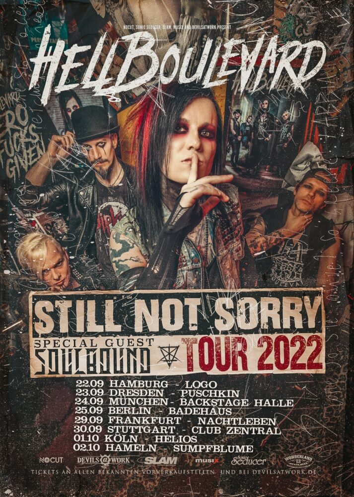 Endlich, nachdem die Tour zum Album pandemiebedingt verschoben werden musste, gehen Hell Boulevard vom 22.09. bis zum 02.10. auf Still Not Sorry-Tour durch acht deutsche Städte. Als Special Guest haben sie DIE Newcomer des Industrial-/Gothic Metal dabei: Soulbound.