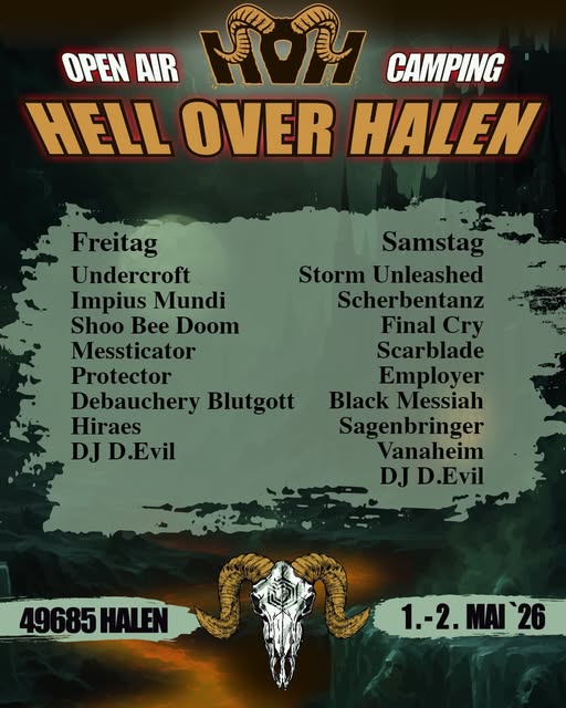 Eventname: Hell Over Halen 2026 Bands: Black Messiah, Blutgott, Final Cry, Hiraes, Impiua Mundi, Messticator, Scarblade, Scherbentanz, Employer, Shoo Bee Doom, Storm Unleashed, Vanaheim, Sagenbringer, Undercroft und Protector Ort: Halen Kosten: Hellbound 2-Tages-Ticket: 76,00 € – Campingticket je Person: 11,00 € Genre:Metal, Thrash Metal, Pagan Metal, Heavy Metal Veranstalter: Hell Over Halen e. V. Link:https://www.helloverhalen.de/