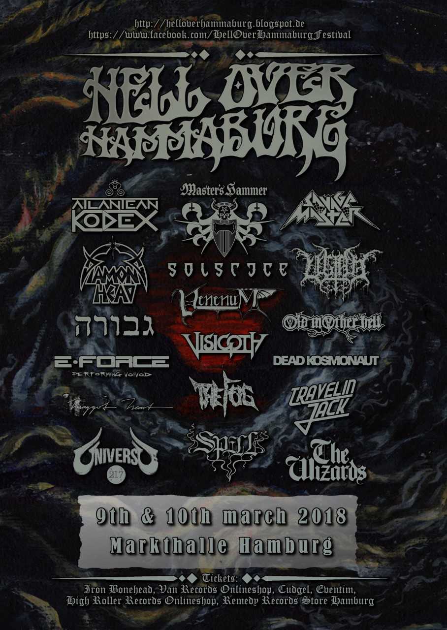 Am Freitag starten Gevurah mit ihrem Black Metal. Direkt im Anschluss erzeugen Dead Kosmonaut die Schwerelosigkeit des Weltraumes, den die Schweden in die Heavy Metal Kutte stecken. Die Kölner Schwarz Metaler Ultha sind schon lange keine Unbekannten mehr und werden mit schweren Geschützen nur derbste Salven abfeuern. Savage Master beginnen ihre Tour auf dem Hell Over Hammaburg, um den tödlichen Occult Heavy Metal anzurühren. Nicht weniger tödlich die Rock beziehungsweise NWOBHM Perle Diamond Head aus Stourbridge. Tag Nummer eins dürfen Master’s Hammer mit harten Black Metal aus dem schönen Prag beenden.
