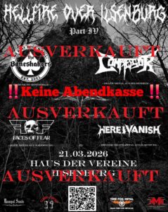 Das Hellfire Over Ilsenburg Part IV am 21.03.2026 im Haus der Vereine in Ilsenburg ist restlos ausverkauft. Der veranstaltende Hellbollwerk e.V. zeigt sich überaus erfreut über die starke Resonanz und bedankt sich ausdrücklich bei den Metal-Fans aus der Region sowie bei den zahlreichen Unterstützern von außerhalb. Auf der Bühne stehen 2026: Boeneshakers, Compressor, Here I Vanish, Zeit und Faces Of Fear.