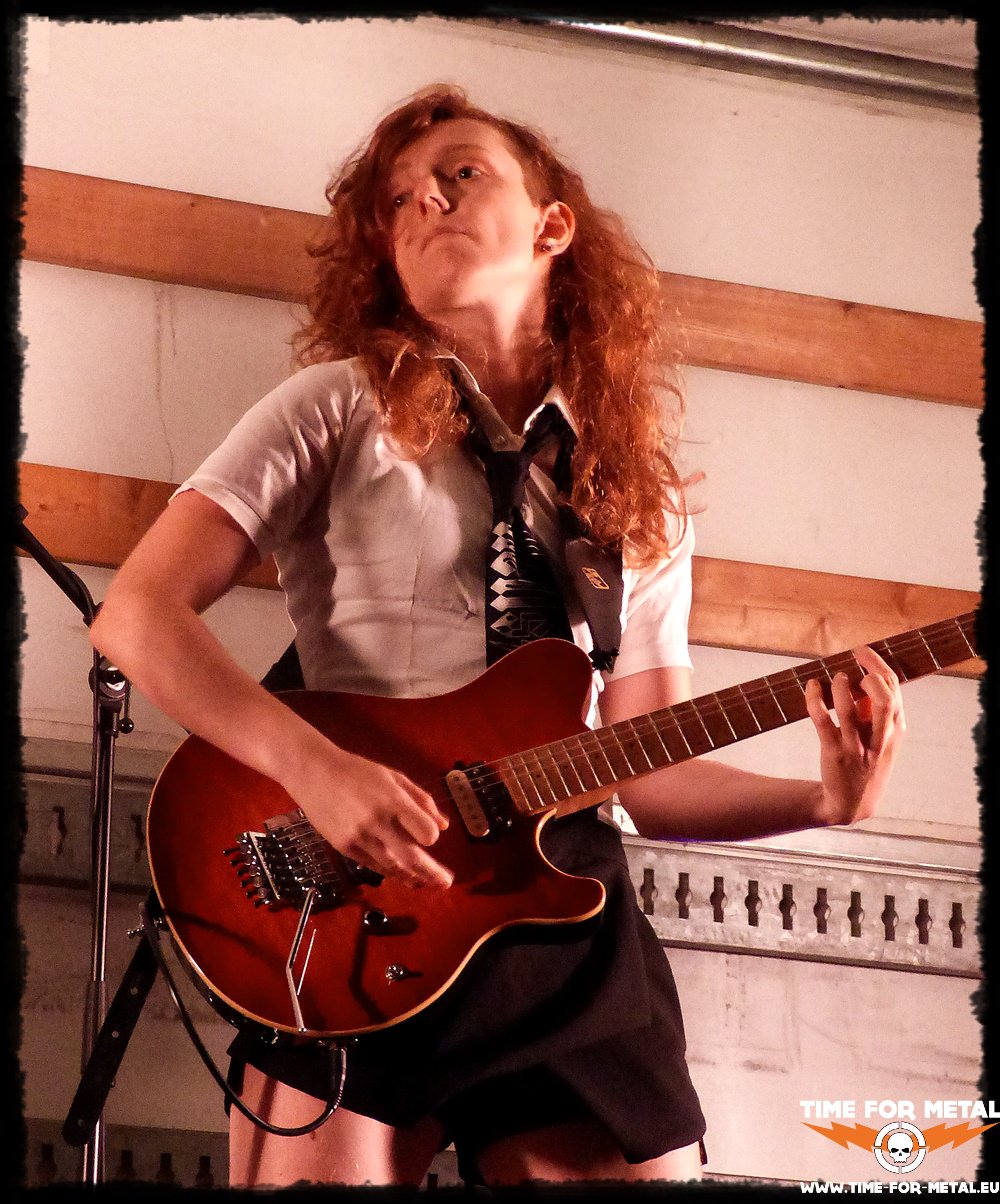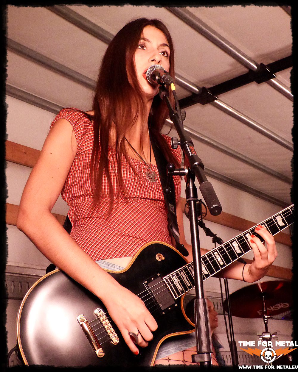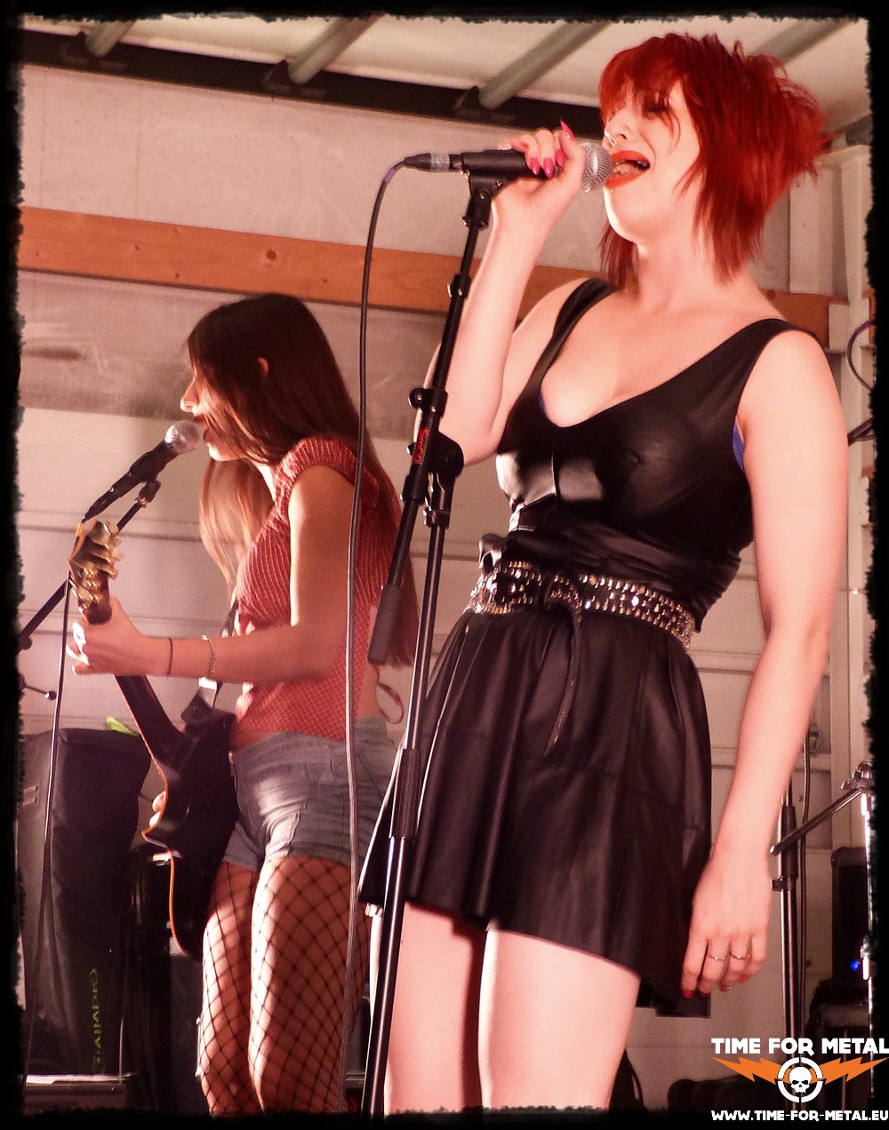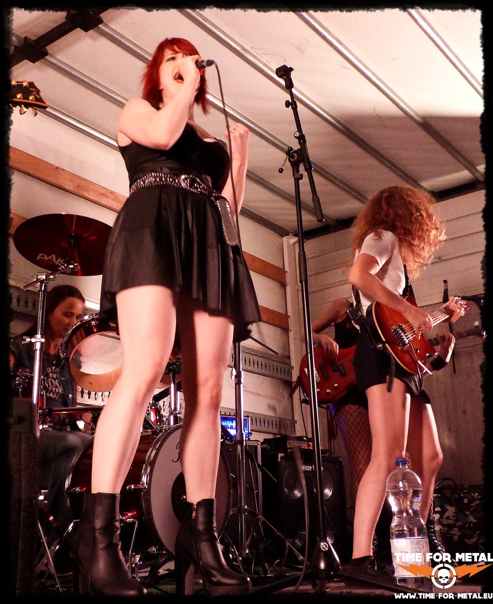 Um 20:30 Uhr soll es eigentlich laut Flyer losgehen, doch die Mädels der Band haben offenbar die Ruhe weg schließlich soll es erst gegen 21Uhr richtig losgehen. Sie gehen zum Umziehen dann in den Ochsen, der ein Stück die Straße runter liegt, um dann gegen 21:10 Uhr die Ladefläche des LKW zu betreten. Der Rathausplatz ist mittlerweile rappelvoll und die All-Girl-Band legt mit Hell Ain`t A Bad Place To Be gleich richtig los. Die Band wurde in Jahr 2002 von Schlagzeugerin Steffi gegründet und konnte sich sehr schnell einen guten Namen erspielen. Die Hell`s Belles spielen zwei Sets à 9 Songs und dabei reiht sich ein AC/DC Klassiker an den nächsten. Das Maulburger Publikum, das überwiegend aus Altrockern samt Familie besteht, scheint begeistert zu sein, denn Songs wie z.B. Back In Black, Thunderstruck oder Touch Too Much werden begeistert aufgenommen und gefeiert. Nachvollziehen kann ich die große Begeisterung nicht so ganz, denn so nah am Original, wie die Band auf ihrer Website behauptet, sind die Mädels nach meiner Meinung definitiv nicht. Dass sie hier auf dem LKW aus Platzgründen nicht die ganz große Show abziehen können, ist ganz klar. Jede steht halt an ihrem zugewiesenen Platz und tut das, was geht, spielen. Der Sound ist okay und auch ihre jeweiligen Instrumente beherrschen die Höllenengel. Das war es dann aber auch leider schon, denn was hier gesanglich abgeliefert wird, das geht gar nicht. Die britische Frontfrau mit den knallig roten Haaren macht zwar optisch was her, aber ihr blutarmes Stimmchen passt so gar nicht zum rotzigen Blues Rock der Australier. Sie kommt weder an die Röhre von Bon Scott,noch an die von Brian Johnson. Nach meiner Meinung Null Power, null Intensität, obwohl sie immer wieder versucht, die Songs mit viel Leidenschaft rüberzubringen. Die Stimme mag beim 08/15-Pop von Dieter Bohlen funktionieren, doch beim Rock’n’Roll à la AC/DC ist sie eine absolute Fehlbesetzung nach meiner Meinung. Auch optisch passt das kurze schwarze Kleidchen nach meiner Meinung eher auf die Schlagerbühne zu Immer Wieder Sonntags mit Stefan Mross im Europa Park. Jeans und Ballonmütze wären es gewesen. Die Gitarristin kommt bewegungstechnisch zumindest ansatzweise an Angus heran, halt den Möglichkeiten hier entsprechend. Auch die weiße Bluse mit schwarzer Hell`s Belles Krawatte sind okay, aber trotz der Wärme hätte ich mir auch hier die Schuluniform gewünscht. Nichtsdestotrotz, ein Hingucker sind die Mädels allemal und viel mehr hat man hier offenbar auch nicht erwartet, denn das Publikum ist begeistert. Nach neun Songs ist das erste Set beendet und die Band verschwindet von der Bühne.