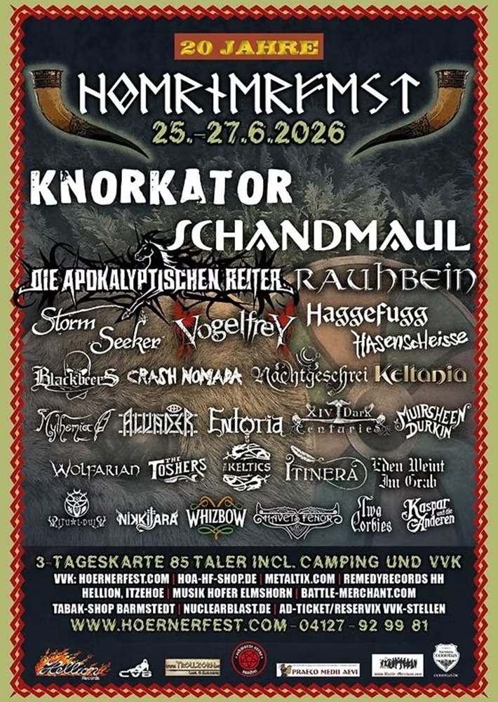 Das Billing für die diesjährige Ausgabe des Hörnerfests füllt sich. Nun hat Veranstalter Thomas Tegelhütter bekannt gegeben, dass Die Apokalyptischen Reiter der Headliner am Donnerstag sind. Weitere Neuzugänge sind Keltania, Crash Nomada und The Toshers. Die beiden letztgenannten Bands sind eher in den punkigen Gefilden unterwegs.