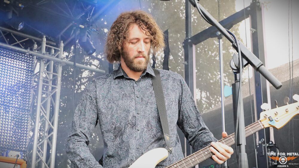 Den Auftakt am ersten Tag macht in diesem Jahr die Band mit der weitesten Anreise: Khan aus Australien. Und sie sind nicht die einzigen Gäste von Down Under – es sind noch weitere Australierinnen und Australier vor Ort. Mehr dazu in den Berichten der kommenden Tage. Die hier auftretende Band Khan ist natürlich nicht zu verwechseln mit der britischen Progressive-Rock-Band gleichen Namens aus der Canterbury-Szene um Steve Hillage (Gong), die lediglich bis 1972 existierte. Die drei Freunde Josh Bills (Gesang, Gitarre, Keys), Mitchell Kerr (Bass) und Beau Heffernan (Schlagzeug) gründeten Khan im Jahr 2016. Seither haben sie mehrere Alben veröffentlicht und begeistern ihre Fans mit einem eigenwilligen Sound: verschwommene Psychedelia trifft auf schwere Stoner-Riffs, kombiniert mit progressiven Rhythmen und fast klageliedartigen Crescendos. Die bereits zahlreich versammelten Besucher*innen sind von den Australiern regelrecht hingerissen – und das völlig zu Recht. PS: die liebe Karin sagte mir, dass Mitchell Kerr nicht mehr dabei ist , seit diesem Jahr heißt ihr Bassmann Will und ist fest dabei.