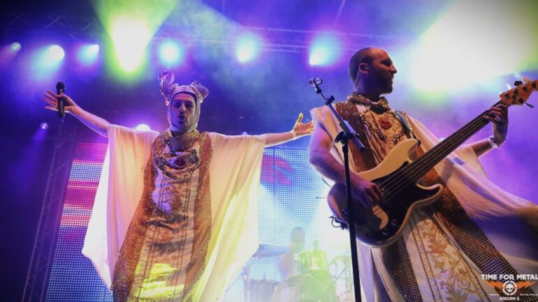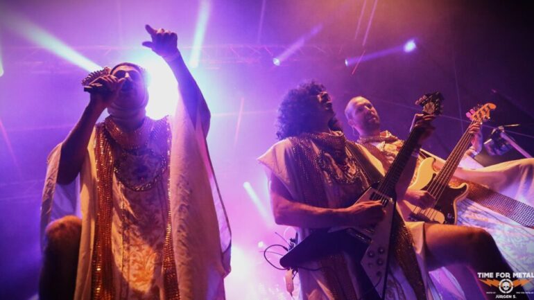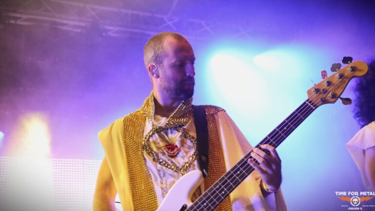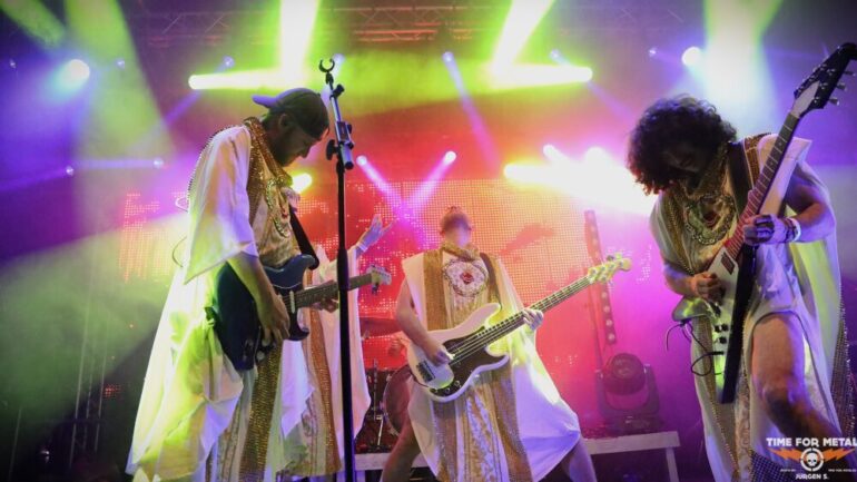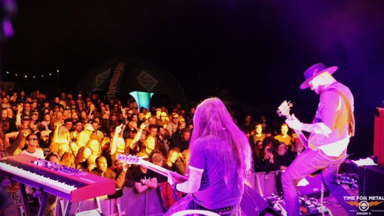 Auch heute gibt es wieder ein Late Night Special. Den Abschluss des Festivals machen Battlesnake, eine Band aus Down Under. Die hatten wir im Juni bereits beim Freak Valley Festival gesehen und wissen, was auf uns zukommt: Die Australier scheinen im Outback Down Under etwas abbekommen zu haben – kostümiert und in Mythen der Vergangenheit schwelgend, reißen sie hier im Outback des Westerwaldes die Stoner-Fans mit einer spektakulären Show mit. Nach dem Freak Valley habe ich Battlesnake als die Sabaton des Stoner Rocks bezeichnet – das trifft es auch heute wieder. Die Show im Dunkeln, mit viel Licht, ist ein intensives Erlebnis. Die Power-Metal-Stoner-Gemeinde ist aus dem Häuschen. Auf der Bühne fehlt allerdings Billy O’Key, der Mann mit dem rosafarbenen Gitarre-Keyboard, der noch auf dem Freak Valley dabei war. Das hatten mir seine Kollegen schon vorher gesagt: Er ist in Australien, weil er Vater wird. Von unserer Seite aus alles Gute für Papa, Mama und Baby.