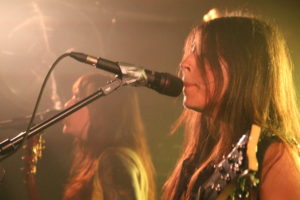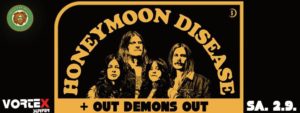 Dafür nehme ich auch mit meiner Frau als Fahrerin eine kleine Ochsentour in kauf. 110 Kilometer eine Strecke, von Koblenz durch die Höhen des Westerwaldes, um die beiden Mädels und die beiden Jungs zu sehen. Nach eineinhalb Stunden Fahrt treffe ich dann auch so um 19:30 Uhr in Siegen ein. Es ist im Vortex alles noch sehr überschaubar. Die nette junge Dame am Einlass frage ich, wann es denn losgeht. Sie meint so gegen 20:30 Uhr. Aber es wird noch später, bis die Vorband Out Demons Out anfängt. Von denen habe ich bisher noch gar nichts gehört und denke da kommt nichts Gutes auf mich zu. Aber gewaltig getäuscht. Die Jungs beeindrucken bereits mit ihrem ersten Song Pale Princess. Sie spielen einen Heavy Psychedelic Blues Rock, der es in sich hat. Das merkt auch das Publikum im mittlerweile gut gefüllten Vortex. Spaßigerweise spielen sie als zweiten Song Time To Go Home. Sie gehen aber noch nicht nach Hause, sondern spielen anschließend noch einige starke Songs, wie Restless Blues und Demonslave, die mir gut in Erinnerung bleiben. Nach sieben Songs ist dann aber Schluss, denn Honeymoon Disease müssen ja auch noch ran. Ich gratuliere der Band für den klasse Gig, den sie heute Abend hier abgegeben haben, und verspreche sie auch gebührend in meinem Bericht zu erwähnen. Sie sind etwas verdutzt und bedanken sich artig.