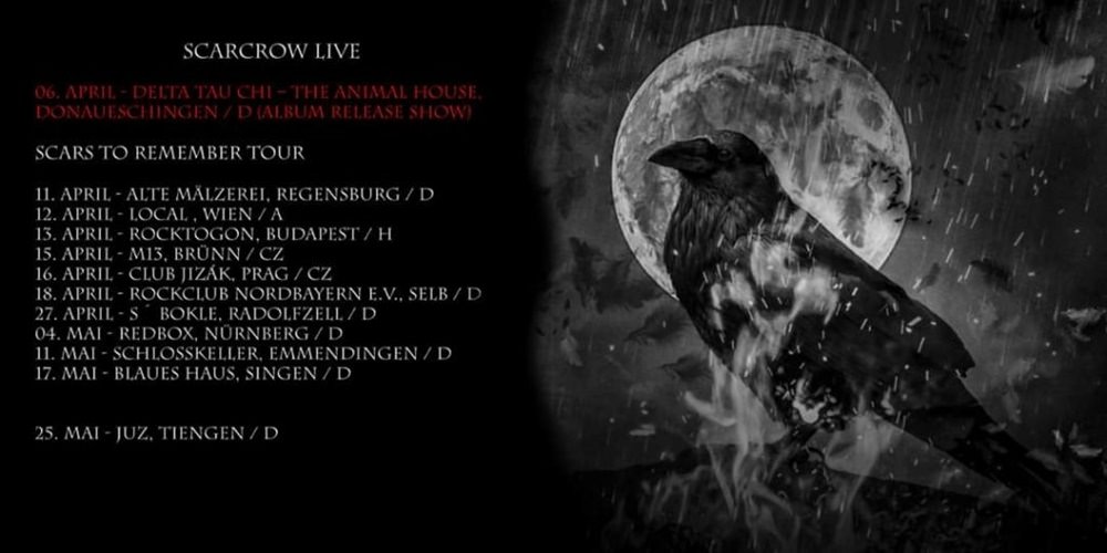 Gegen 21:00 Uhr ist es dann aber soweit und die Narbenkrähen von Scarcrow betreten zu einem kurzen Beyond The Black RainbowIntro die Bühne und steigen dann mit S.W.T.W.C.A. (Something Wicked This Way Comes Again) in ihr Set ein. Der Midtempo Rocker stammt vom aktuellen Album Beyond The Black Rainbow und besticht mit ordentlichem Double-Bass Einsatz. Erst kürzlich habe ich etwas gelesen, da wurde Frontmann Damon Fry als eine Mischung aus Blaze Bayley (ex-Iron Maiden) und Frank Knight (ex-X-Wild) verglichen. Das kann ich so nicht unterschreiben, aber zumindest muss man sofort an Gitarrist Eric Draven aus dem 1994er-Hollywoodstreifen The Crow denken, während er hier auf der Bühne seinen Baseballschläger schwingt, oder im nächsten Song Blood Brother mit einem Butterfly Messer herumfuchtelt. Überhaupt geht es recht düster zu und die Songs triefen nur so vor Melancholie und die Depressionen, Traurigkeit und Wut sind deutlich spürbar, was noch durch ein dunkles Make-Up und Outfit unterstrichen wird. Die 2015 im württembergischen Donaueschingen gegründete Band hat sich dem erdigen Hardrock verschrieben und zählt Größen wie zum Beispiel Black Sabbath, Alice Cooper und Ronnie James Dio zu ihren Vorbildern. Was hier auf der Bühne zelebriert wird, geht dann aber doch eher in Richtung Dark Rock, eine gelungene Mischung aus Black Sabbath, The Sisters Of Mercy, The 69 Eyes, Lacrimas Profundere und einer Prise Krokus oder Shakra, aus der sie aber ihr ganz eigenes Süppchen kochen. Nach und nach zieht es dann auch die Leute herein, die bis jetzt noch rauchend und Bier trinkend vor der Tür standen. Der Laden wird zwar nicht voll, doch die wenigen Gäste sind in Partystimmung und versammeln sich vor der Bühne. Nummern wie Rock ’n‘ Roll Killing Machine, Stagefryght und Children Of The Crow bringen dann auch Bewegung vor die Bühne, es wird getanzt, gebangt und gegrölt, der Düster Rock kommt beim Emmendinger Publikum gut an. Besonders der charismatische Frontmann weiß mit seiner tiefen, kratzigen Stimme und seinen Gesten zu gefallen und erntet den verdienten Applaus. Aber auch die Saitenfraktion, in Form von Gitarrist Matthias Schorp und Bassist Simon Schorp, weiß zu überzeugen. Showmäßig ist auf dieser kleinen Bühne natürlich nicht viel drin, jeder von beiden post auf seiner Seite vor sich hin, doch Matthias haut so manches nette Riff raus, während Bruder Simon, übrigens der einzig Langhaarige auf der Bühne, gemeinsam mit Schlagwerker Tobias Wehrle den passenden Rhythmusteppich webt. Gitarrist Matthias und Shouter Damon waren zuvor schon in dem Acoustic-Melancholy-Duo The Night Shift aktiv und die folgende Powerballade Mr. Lee erinnert dann ein wenig an die frühere Ausrichtung und bringt etwas Abwechslung. Mit Jezebel, dem In Control Cover Destroy Me und Born Guilty geht die Geisterbahnfahrt dann jedoch in gewohnter Manier, inklusive Kunstbluteinlage, weiter. Eine Instrumentaleinlage nutzt der Frontmann dann für einen kurzen Ausflug an die Bar, jedoch zur Märchenstunde von Wolf In Sheep`s Clothin` und zur Special Show Einlage von In Control Sängerin Julie ist er zurück. Diese hat sich zwischenzeitlich eine Wolfsmaske übergezogen und räkelt sich zu Damons Füßen auf der Bühne und tanzt im Wolfskostüm, was im Publikum zu Pfiffen und Gejole führt. Das rote Tuch, das sich der Sänger dann auf den Kopf legt, soll wohl eine Anspielung auf Rotkäppchen sein und sorgt für Gelächter. Man ist eben doch nicht ganz sooooo düster, wie man sich auf der Bühne gerne darstellt, aber Klappern gehört halt zum Handwerk. Das anschließende It Can`t Rain All The Time ist wie auf dem Scarcrow Debüt Beyond The Black Rainbow auch, ein Duett zwischen Damon und Julie, die aber leider hier in dieser Location kaum zu hören ist. Das tut der guten Stimmung aber keinen Abbruch, den absoluten Top-Sound erwartet im Schlosskeller sowieso niemand. Ob die beiden im früheren Leben Wetterfrösche waren, kann ich nicht sagen, aber tatsächlich hört es nun wirklich auf zu regnen. Mit Scars Behind The Mask geht dann ein unterhaltsamer Auftritt zu Ende, der sich ganz klar von anderen seiner Art abhebt.