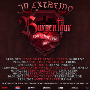 Unter diesem Banner werden die Spielleute von In Extremo auch 2022 wieder durch die mittelalterlichen Burgen und Schlösser des Landes ziehen und ihr Publikum auf eine einzigartige Reise in ihre eigene musikalische Vergangenheit mitnehmen! Für 2022 werden die Sechs ein ganz besonderes Programm für ihre Fans vorbereiten – man darf sehr gespannt sein und sich auf einige schon lange nicht erhörte Lieder freuen! Auf insg. 8 Burgen und Schlössern werden In Extremo es 2022 wieder ordentlich krachen lassen! Die Band ist jetzt schon voller Vorfreude auf den anstehenden Sommer und sendet Grüße: