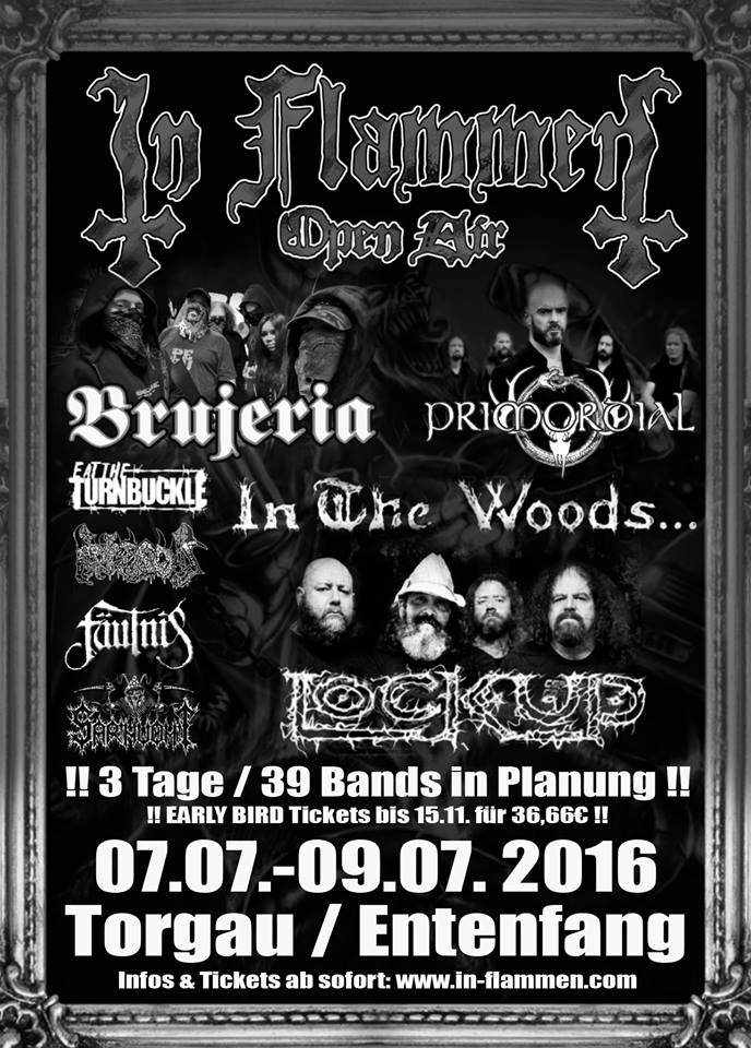 Fans des Black, Death und Thrash Metal werden auch in der nächsten Runde wieder gut bedient. Den Schwarzmetall vertreten hier bei jetzigem Stand vor allem In The Woods aus Norwegen und Primordial aus Irland. Die Ausnahmegruppe Brujeria deckt den Death-, bzw. Grindcore ab. Ebenfalls genretechnisch nicht weit entfernt Lock Up. Ein Highlight des In Flammen 2016 außerdem die „Black/Extreme Metaller“ (ja…so richtig einordnen lässt sich der Spaß leider nicht) Fäulnis, welche wohl einige Fans heiß ersehnen.