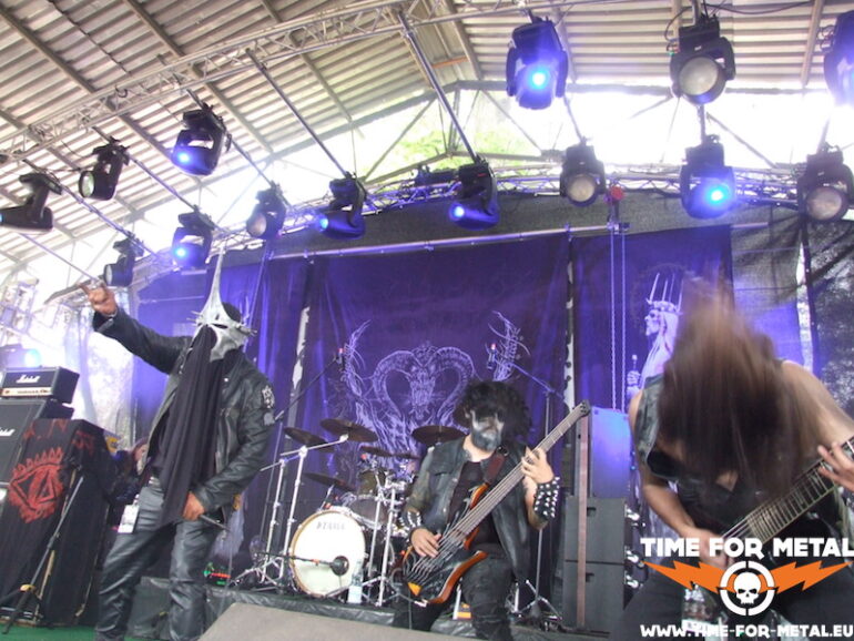 Wir bleiben in schwarzmetallischen Gefilden, und der Bandname Ash Nazg Burz lässt den Tolkin-Fans unter den Anwesenden sicherlich schon den Schlüppie feucht werden. Als dann in der schwarzen Sprache als Intro das Ringgedicht vom Band rezitiert wird und der Sänger in Sauronmaskierung die Bühne betritt, bricht ein ungeheurer Jubel los, der sicher die Grundfesten Mittelerdes erschüttert hätte. Insgesamt wird gutklassischer Black Metal geboten; der eine oder andere Titel trägt offensichtlich gleichfalls Titel in Mordor-Sprech, was mich als Tolkinanhänger zu der Frage führt, ob da draußen eine Art Übersetzer für diese ausgeklügelte Fantasiesprache existiert? Neben R’lyanisch und Klingonisch ist die echt wie geschaffen für Schwarzmetall, oder? BM ist zwar keine Hauptmahlzeit auf meinem schwermetallischen Speisezettel, aber das hier macht echt viel Spaß. Nach ein paar Songs ist dem Fronter die Maske dann doch zu warm oder zu unbequem. Kann man ihm bei dem schönen Wetter echt nicht verdenken.