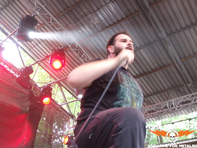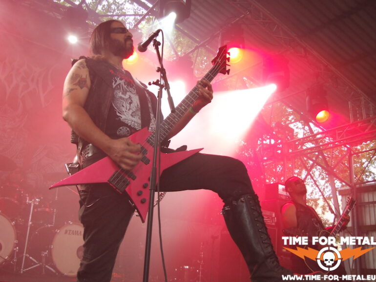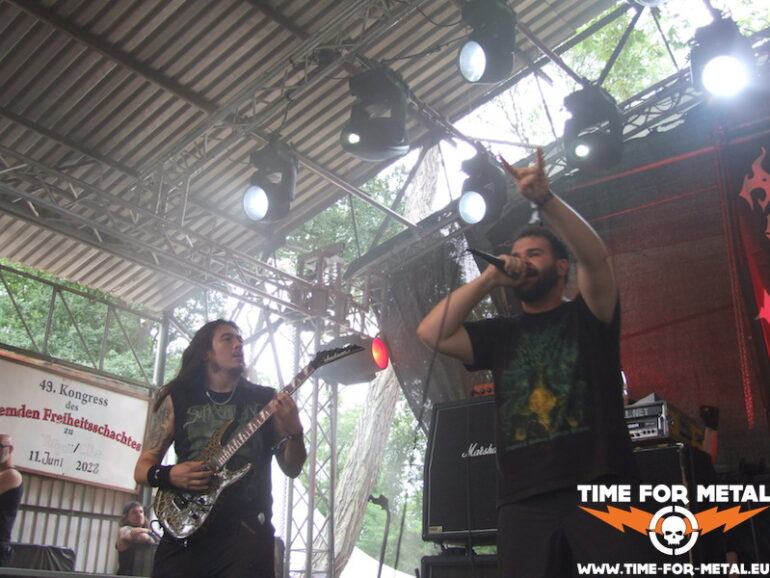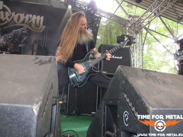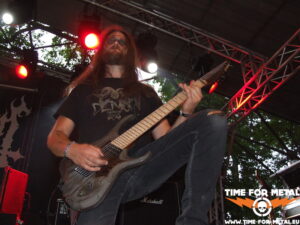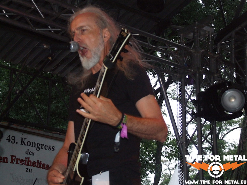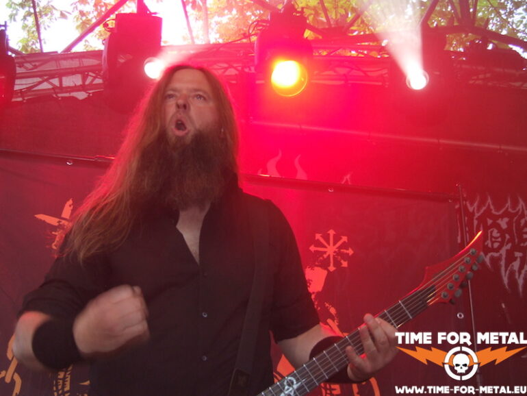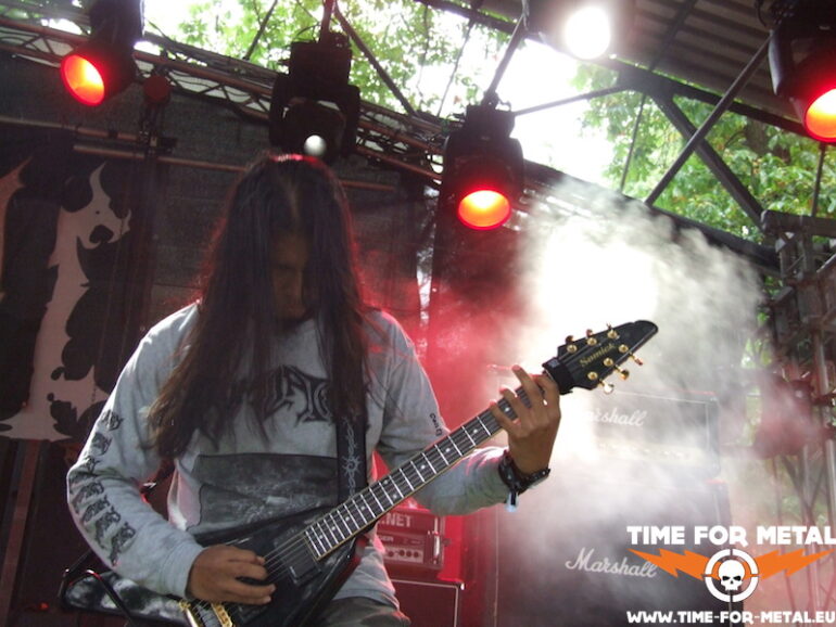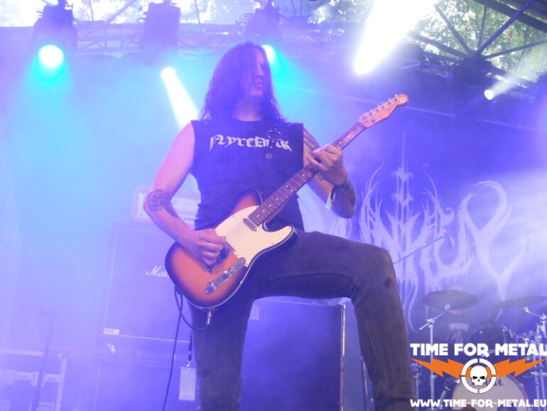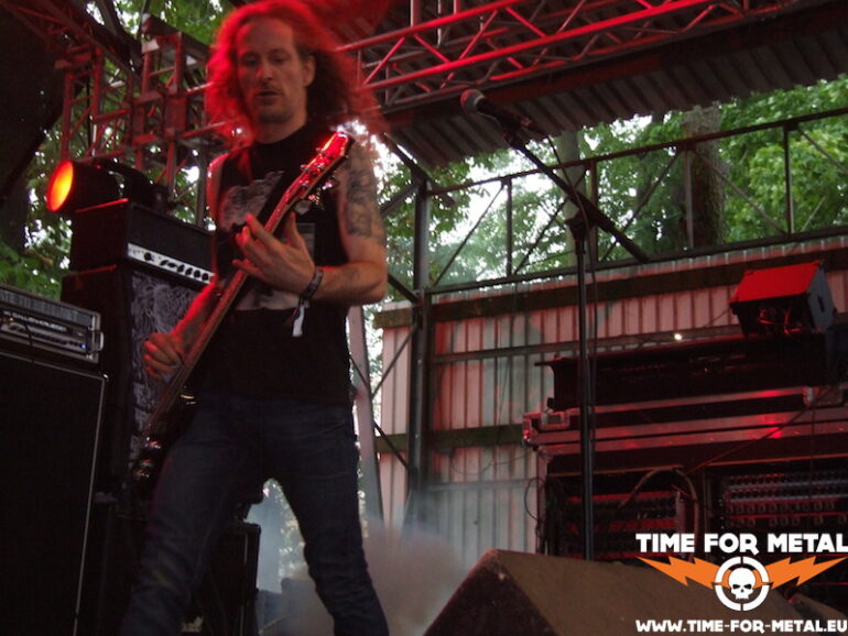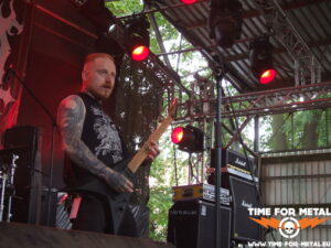 Der Opener des Tages kommt aus meinem schönen Bundesland Sachsen. Bühne frei für die Leipziger Mýrdal. Verdammt schneller Schwarzetall pfeift über das sonnige, von Bäumen umstandene Zuschauergelände. Zwar nicht ganz dieser grim’n’frostbitten-Stil, aber nahe dran. Prinzipiell hat man den Eindruck einer Ein-Mann-Show. Der Drummer versteckt sich weitestgehend hinter seinem Kit, glänzt jedoch mit einem beinahe durchgehenden Blast-Gewitter. Nur Fronter Willy schreit seine klagenden Lyrics förmlich gegen die unbarmherzige Sonne. Dabei fliegen seine Finger über die Saiten deiner blutroten Flying V, die ebenfalls den Bass-Amp mit einem Signal versorgt. Typisch für dieses Genre – da musste ich mich seinerzeit auch erst dran gewöhnen – ist die mangelnde Kommunikation mit dem Publikum und dessen Bewegungsarmut; Zugabe? Fehlanzeige natürlich. Die Musik ist allerdings echt klasse, kann man sich mal vormerken.