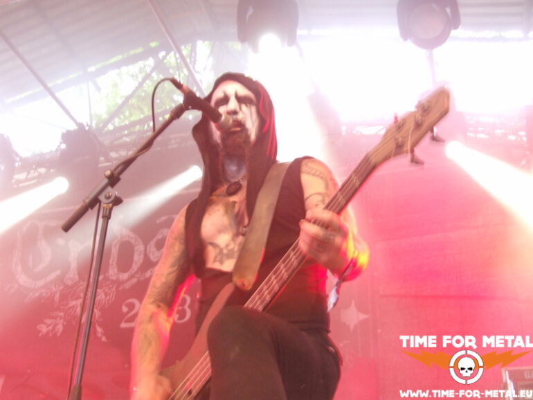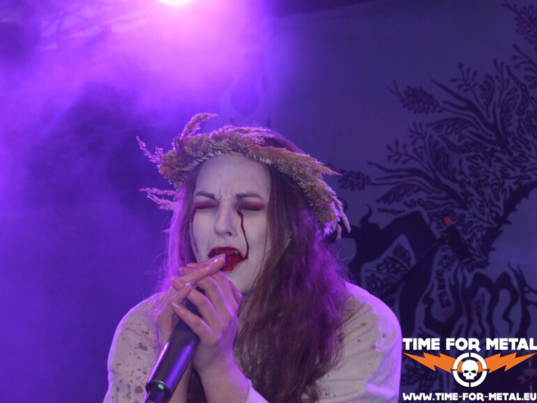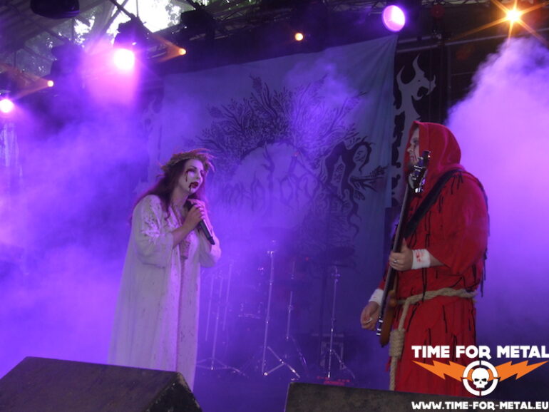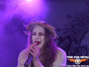 Meine persönliche Überraschung dieser IFOA-Auflage stammt aus dem Belarus. Die Band Dymna Lotva, deren Name etwa so viel bedeutet, wie rauchende Sümpfe, hat eine großteils traurige Geschichte. Unter anderem diese prägt die Art ihrer Musik, ihrer Lyrics, und auch ihrer Art der Darbietung on Stage. Herzstück der Formation ist Katsiaryna „Nokt“ Mankevich, eine zierliche, aber nicht minder energiegeladene junge Dame mit einem Stimmumfang ähnlich der von Onielar von Bethlehem und DNS auf einem Trip als Opernsängerin. Schneeweißes, aber blutbesudeltes Kleid, eine Art Dornenkrone, einen Galgenstrick um den Hals und blutige Tränen, wie die tragische Jungfrau Maria höchstselbst. Die beiden Mitmusiker in blutrote Roben gehüllt, so performen die Weißrussen eine extrem emotional durchsetzte Bühnenshow, bei der mir mehr als einmal ein Schauer durch die Knochen fährt. Mein Russisch ist leider extrem eingerostet, aber ich bin mir ziemlich sicher, dass wir auf der Bühne insgesamt eine Art zusammenhängende Geschichte erleben. Kann das vielleicht irgendjemand bsetätigen? Das war eine großartige Dreiviertelstunde. Echter Geheimtipp!