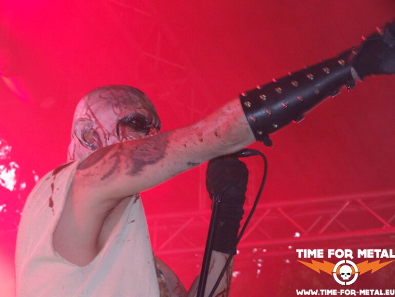 Bandname und Backdrop lassen zum zweiten Mal an diesem Wochenende etwas Gore-haltiges vermuten. Sublime Cadaveric Decomposition zelebrieren zum Großteil genau diese Richtung, allerdings ist bei den Franzosen auch ein Gutteil Brutal Death mit im Spiel. Anfangs benehmen sich die typischen Gore-Fanscharen auffällig gesittet, aber nach drei Songs beherrscht der Kreis das Geschehen bis zum Schluss des Gigs. Wieder mal spaßig anzusehen, wie die Meute mit Tafelzirkel, Seifenblasenmaschine, Pappaufsteller und diversen Schwimmtieren eskaliert, Ich glaub, die Mucke muss nur laut, schnell und verrückt genug sein, um die Massen derart zum kollektiven Ausklinken zu bekommen. Fakt ist, dass auch oder gerade schwermetallische Partypeople sich vom Wetter keinesfalls kleinkriegen lassen und so haben halt auch die Pariser eine ganze Menge Zuspruch von vor der Bühne.