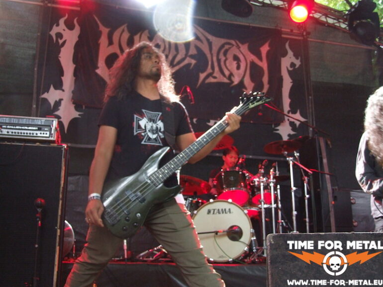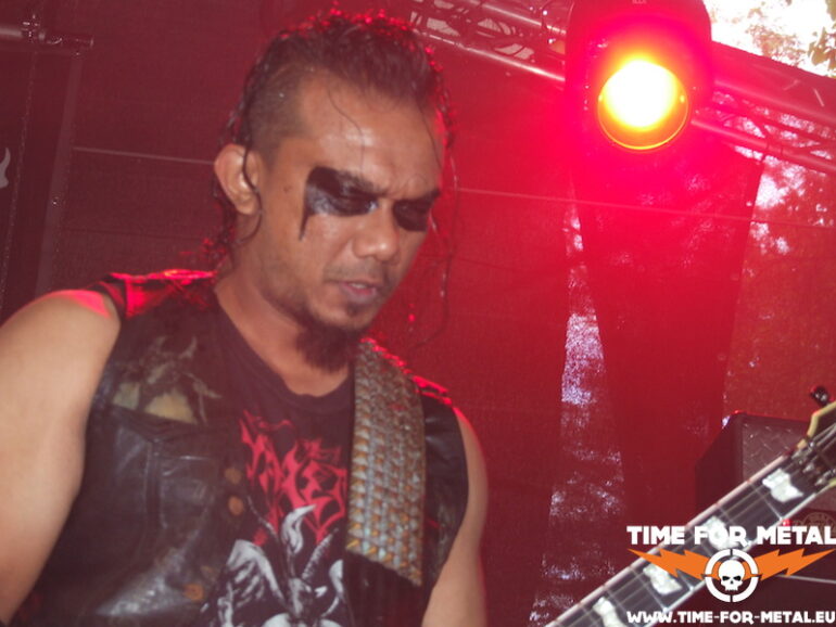 Gegen eins betritt El Cheffe die Hauptbühne und begrüßt die Zuschauer. Sind deutlich weniger als gestern. Aber bei dem immer stärker werdenden Regen ist das auch kein Wunder. Den Startschuss geben heute die Malaien von Humiliation. Die zunächst unscheinbare, beinahe zurückhaltende Formation legt allerdings vom ersten Akkord an schön derbe los. Feinste Riffs, akzentuierte Drums und Bassläufe, vor allem aber die etwas monotonen, aber schön fiesen Growls wissen von Anfang an schwer zu begeistern. Gerade bei den Vocals staune ich sehr, wo Bear-Bee Sharizam die eigentlich hernimmt. Auch seine Mitmusiker sind die reinsten Duracell-Hasen, echte Energiebündel. Südostasiaten sind ja ein eher kleiner Menschenschlag, aber da darf man sich keinesfalls täuschen lassen. Auch wenn die Jungs bei ihren Ansagen die Sanftheit in Person sind, wo sie musikalisch zuschlagen, wächst sprichwörtlich gesehen kein Gras mehr. Ein sauberer Gig, bei dem die Nässe von oben nicht mehr wirklich ins Gewicht fällt, und ich mich schon tierisch auf einen weiteren Auftritt der Jungs vom Break Out Open Air im September im Ferienland Crispendorf in Thüringen freue.