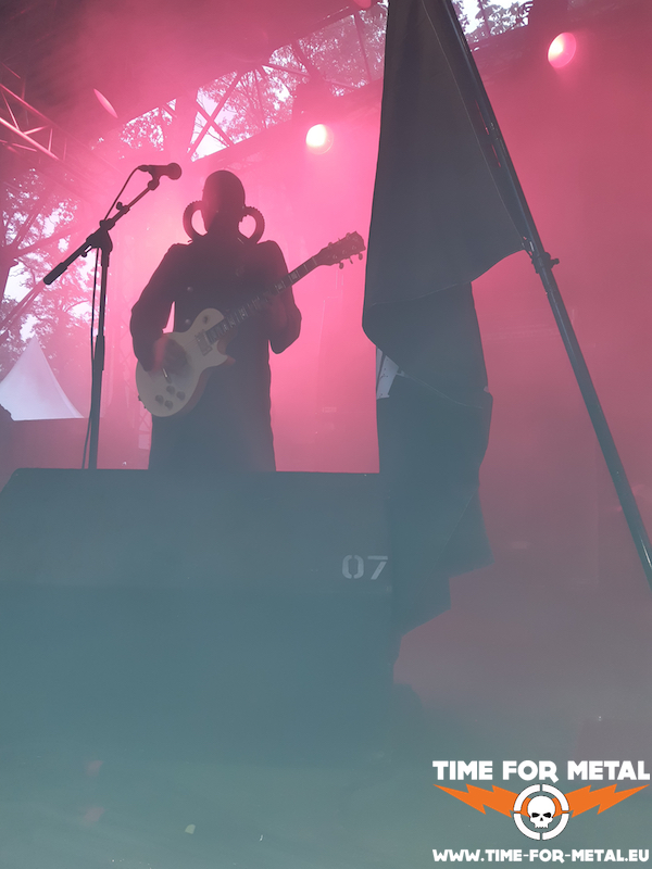 Weiter im Text geht’s mit ebenfalls deutlich melodieorientiertem Black Metal, wobei hier die Melodien nur eine stark untergeordnete Rolle spielen. Hauptaugenmerk der Schweden Lömsk liegt hörbar auf Verzweiflung und Tragik. Im vergangenen Jahr debütierten die Göteborger mit ihrem recht überzeugenden Studioalbum Act 1, woraus auch die heutige Setlist weitestgehend bestehen dürfte. In den letzten Jahren sind ja Masken beziehungsweise Kapuzen im Black Metal sehr modern geworden. Auch diese Jungs treten geschlossen maskiert auf, jedoch eher mit Gasmasken oder solchen, die an imperiale Kampfpiloten aus Star Wars erinnern. Schon wieder so etwas wie Individualismus im eher uniformen Schwarzmetall. In Verbindung mit dem großteils rot ausgeleuchteten Bühnennebel wird so eine ziemlich tolle Optik erzeugt. Mit der eher langsamen, doomig-tragischen Instrumentalisierung versetzt zumindest mich das in einen beinahe meditativen Zustand.