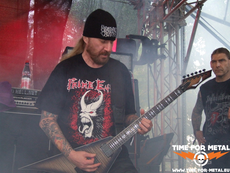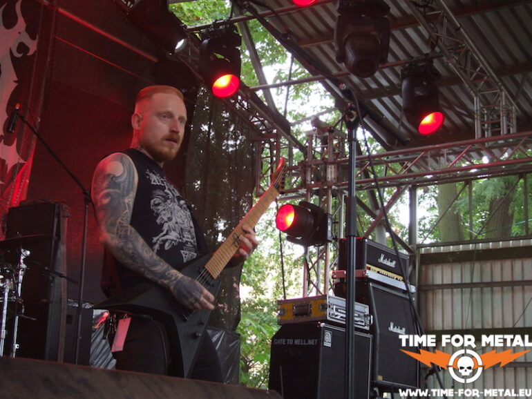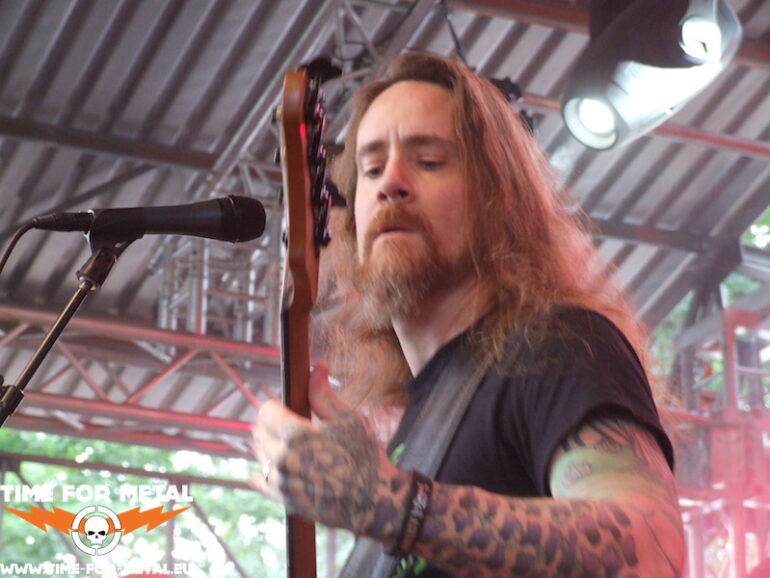 Wir bleiben bei im Death-Metal-Sektor. Malevolent Creation, gute alte Bekannte der brutalen Spielart dieses Genres, betätigen sich in Torgaus schwermetallischem Gemüsegarten als Abrissbirne. Zwar ist von den Gründungsmitgliedern auch nur noch Gitarrenhexer Phil Fasciana übrig, nichtsdestotrotz liefern er und seine drei Mitstreiter eine saugeile Todesblei-Show ab. Besonders markant ist dabei der fiese bellende Gesang von Basser Jelle Jolly, der die Truppe seit letztem Jahr am Mikro verstärkt. Könnte glatt zum Trademark der Band mutieren; wir werden sehen. Der Platz vor der Bühne füllt sich nun immer mehr, die meisten Besucher dürften ausreichend ausgeruht und gestärkt sein, auch der Tank ist bei so manchem unübersehbar gefüllt – so soll’s sein. Ein oder zweimal hat die Grabensicherheit durch einschwebende Crowdsurfer mal was zu tun. Als Zugabe bringt die Band den inhaltsschweren Song Blood Brothers vom 95er-Album Eternal. Animals we are, not men.
