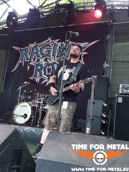 Heute stehen unter anderem Raging Rob auf der Running Order. Ich erfahre, dass die Jungs bereits auf dem Gelände sind, und da ich deren Gitarristen kenne, arrangiere ich ein kurzes Treffen mit ihm. Ist ja noch eine ganze Kante Zeit, bis die erste Band des Tages Stagetime hat. Es ist echt schön, mit Dirk mal wieder einen Plausch zu halten nach so langer Zeit; seinerzeit war er ja noch Klampfer bei der Speed-Metal-Kapelle Warrant. Ich wandere danach noch etwas planlos übers Gelände; als die festivaleigene Merch-Bude öffnet, erwerbe ich dann das obligatorische Festivalnicki und warte danach Füßescharrend auf den Startschuss auf der Hauptbühne. Pünktlich zehn nach halb eins begrüßt Veranstalter Thomas die bereits beachtlich erschienene Besuchermenge und gibt die Hauptbühne frei für beinahe zwölf Stunden schwermetallischen Wahnsinn.