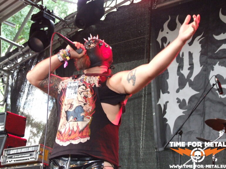 Zwar hatte ich in diesem Jahr im Vorfeld deutlich weniger Zeit, mich mit dem Billing auseinanderzusetzen, entsprechend habe ich auch nicht in die mir unbekannten Bands reingehört. Allerdings weiß man manchmal einfach vom Bandnamen her, was da auf einen zukommt. Bei Urtikaria Anal ist direkt klar: Grindcore oder Goregrind. Und als ich dann des Trios ansichtig werde, weiß ich noch vor dem ersten Akkord, dass ich recht hab. Alle drei mit BDSM-Masken, Frontmann mit umgeschnallten Kunstmöpsen und auch ein Großteil des aufmarschierten Auditoriums lässt auf ein Spektakel schließen, das in besagtem Genre verortet ist. Wer mal Gast auf einem Event wie beispielsweise dem Obscene Extreme war, weiß, was ich meine. Die Musiker geben sich als Mexikaner zu erkennen und dann folgen knapp 40 Minuten lärmender, gut gelaunter Irrsinn – auf und vor der Bühne. Für mich ist das unvorstellbar, mir sowas aus der Konserve anzutun, aber live ist das faszinierend und witzig zu verfolgen, ich habe echt meinen Spaß. Aber ich versteige mich mal zu der gewagten These, dass ein ganzes Festival nur mit sowas nüchtern nicht machbar ist.
