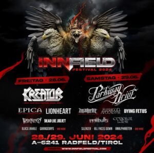 Das neue Festival im Westen Österreichs. Das Innfield Festival konnte mit Kreator, Epica, Imminence, Fleshgod Apocalypse und Crystal Lake gleich fünf Acts gewinnen, die 2024 in Österreich ihre einzige Festivalshow am Innfield Festival spielen werden! Eine einzigartige Chance, die man sich nicht entgehen lassen darf!